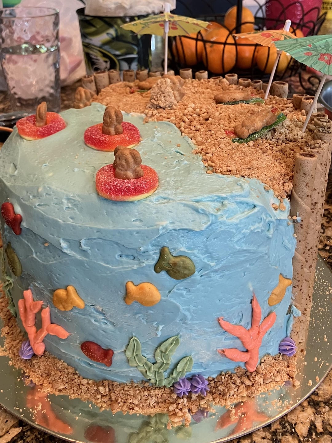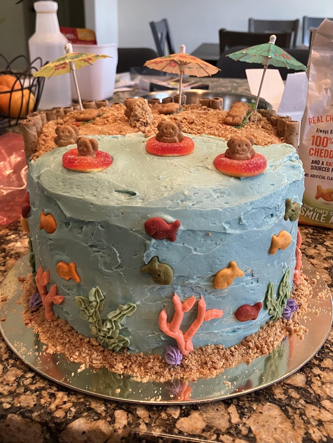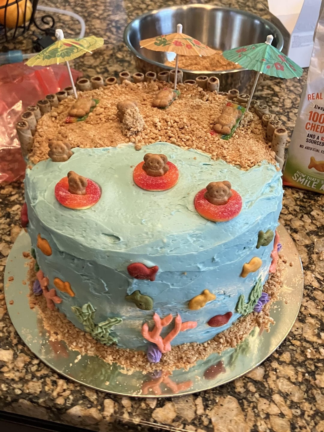 This is amazing! The bear building the sand castle is chefs kiss. I love a cake like this because you just notice more and more thoughtful details the more you look!