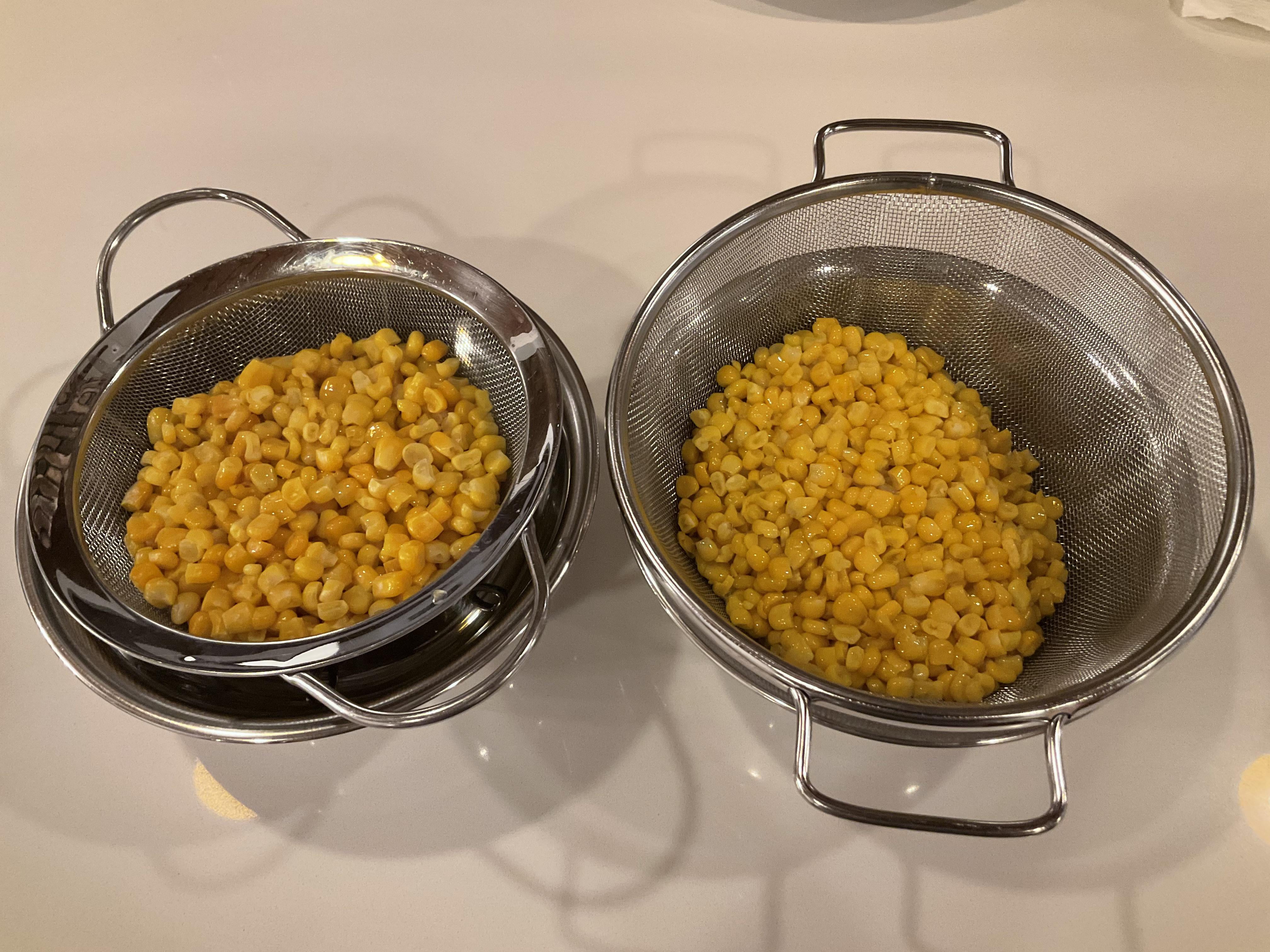 Folks had very strong, mostly negative reactions to a question I posed earlier today about cooking frozen corn sous vide. (I happened to have a big pot of hot water from doing sous vide BBQ ribs, which were outstanding by the way, so it seemed like it might be a fun experiment to try while I was finishing the ribs in the oven.) Undaunted, I vacuum-sealed one bag of frozen corn with one tablespoon of butter and cooked it at 184 for 45 minutes. I microwaved a comparable bag of frozen corn (steam-in-the-bag) for the recommended length of time, then tossed it with one tablespoon of melted butter. In a blind tasting, there was a clear flavor favorite, or flavorite if you will, according to my wife.