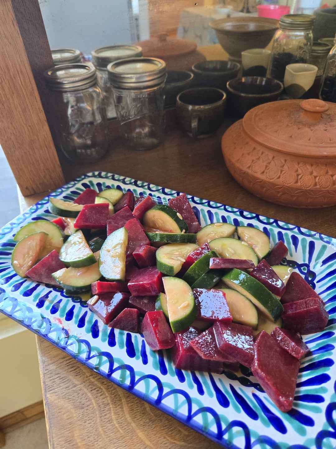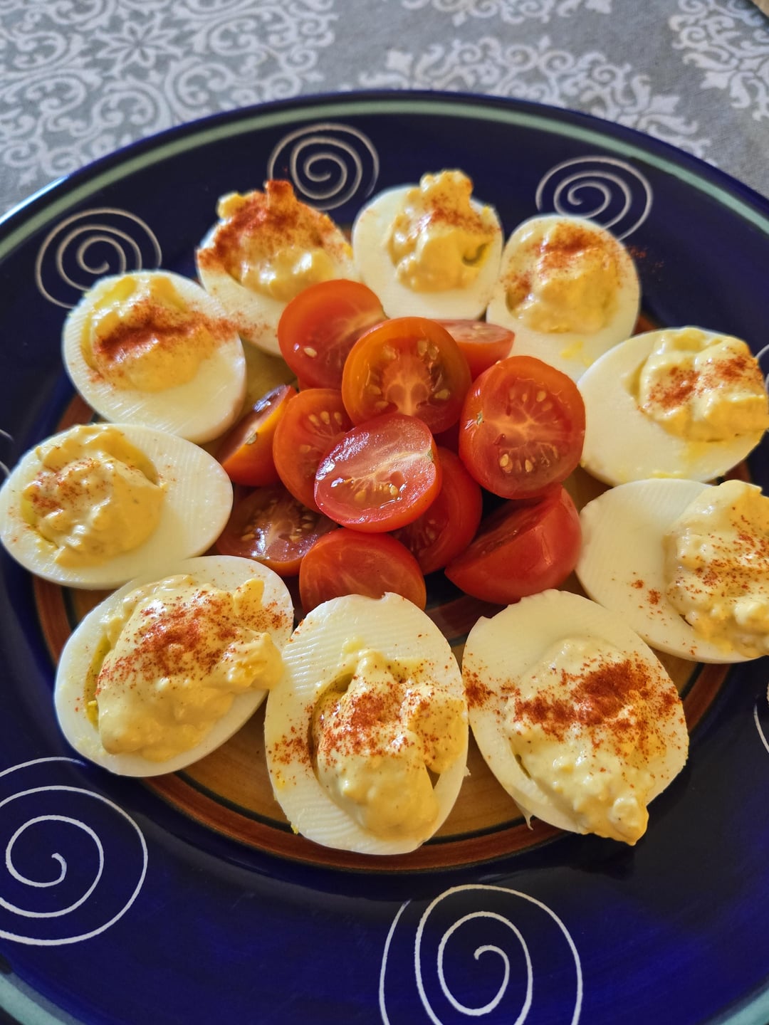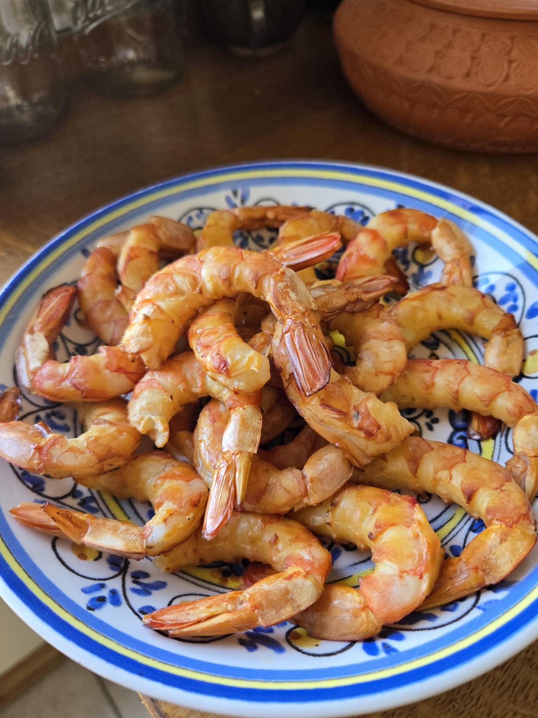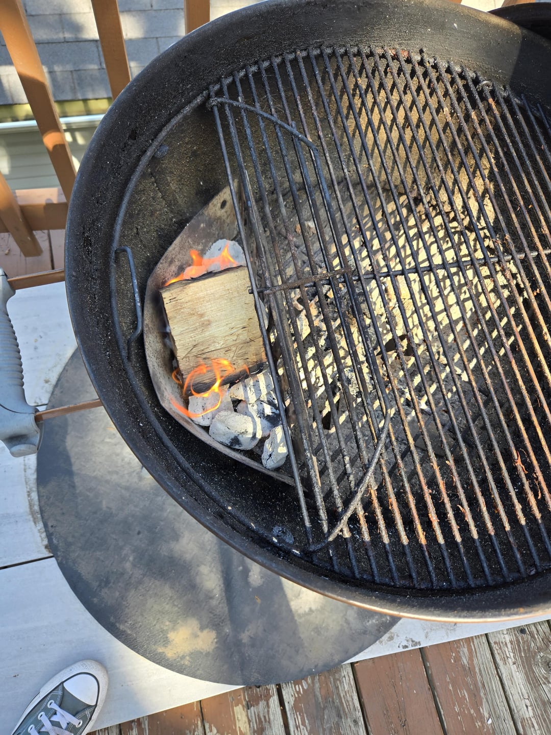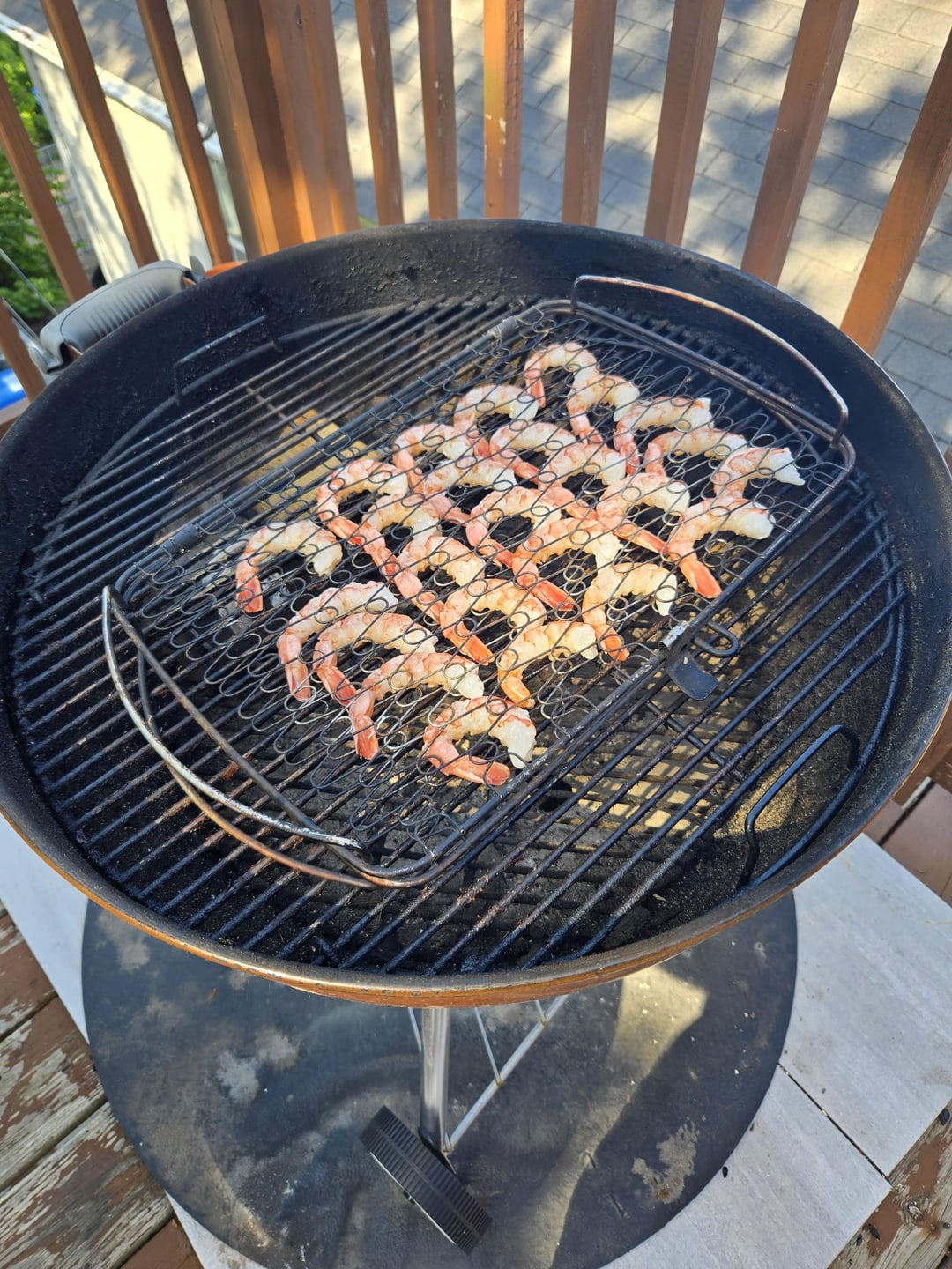 Smoked some shrimp on the Weber Kettle for our Midsommar celebration. Showing you the set up, and after the wood fully caught fire, put on the lid and nearly closed both top and bottom vents and waited I until the temp evened out at 250F. Used a basket for the shrimp and smoked them for 45 minutes. Turned out great. We also had deviled eggs and a beet and cucumber salad.