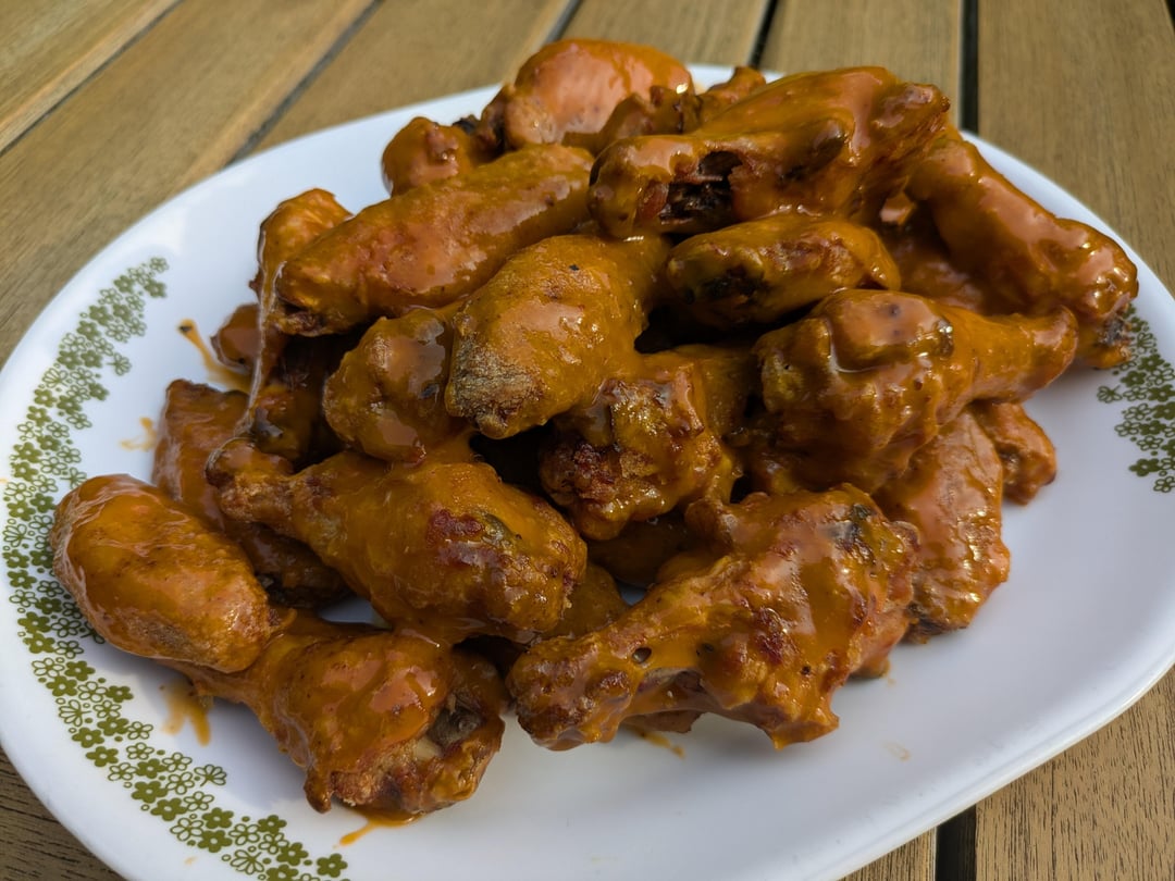 Tossed in Steve's & Ed's Buffalo sauce with some added El Yucateco habanero sauce.