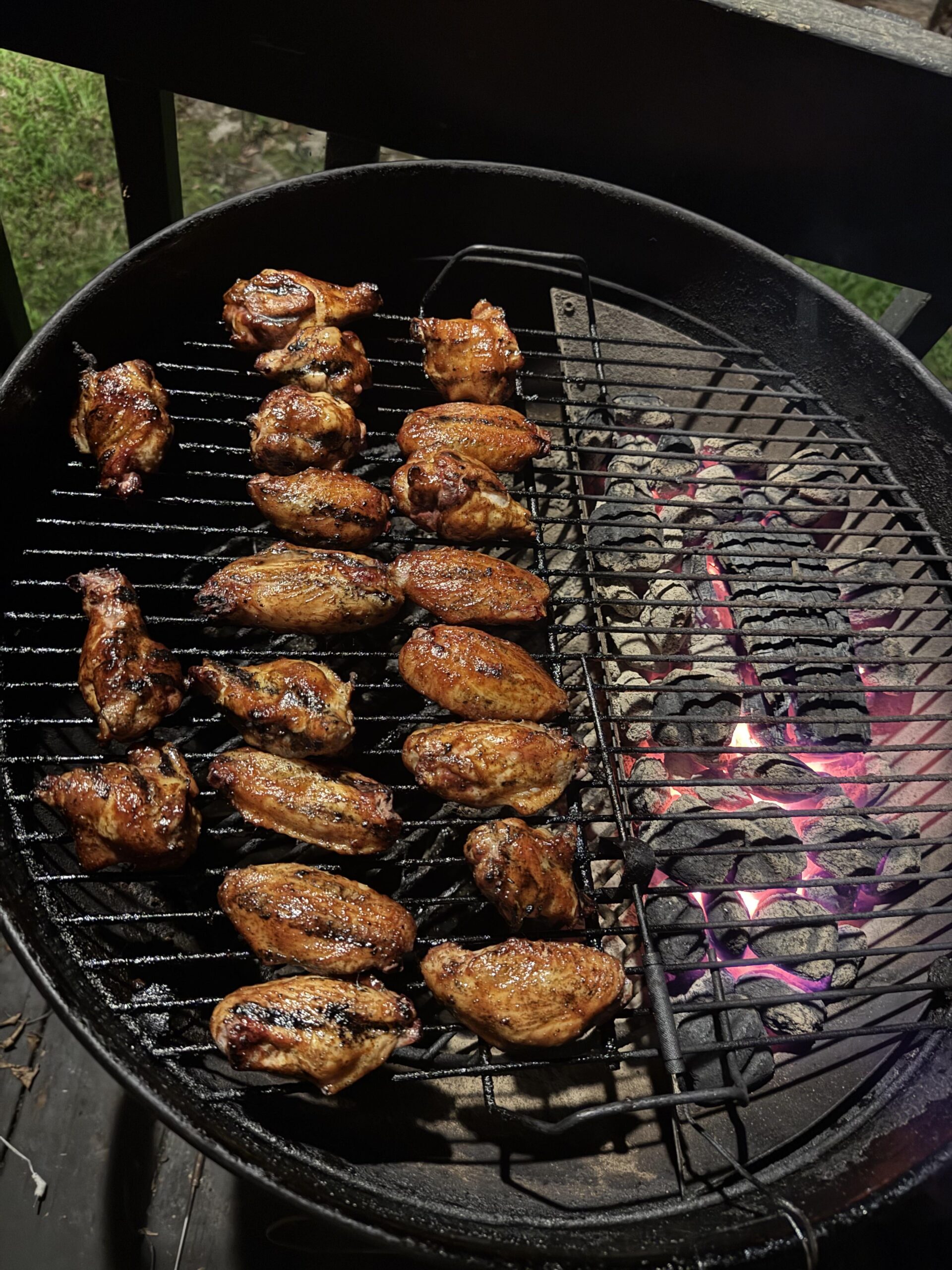I rotate the grill over coals and sear the wings on a rotation so I get a little crisp and grill bark.