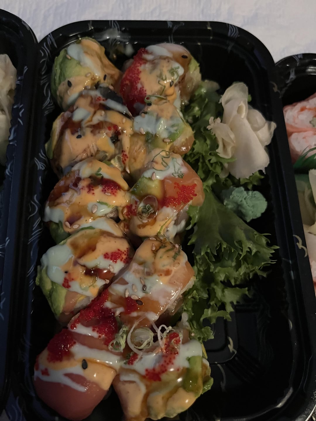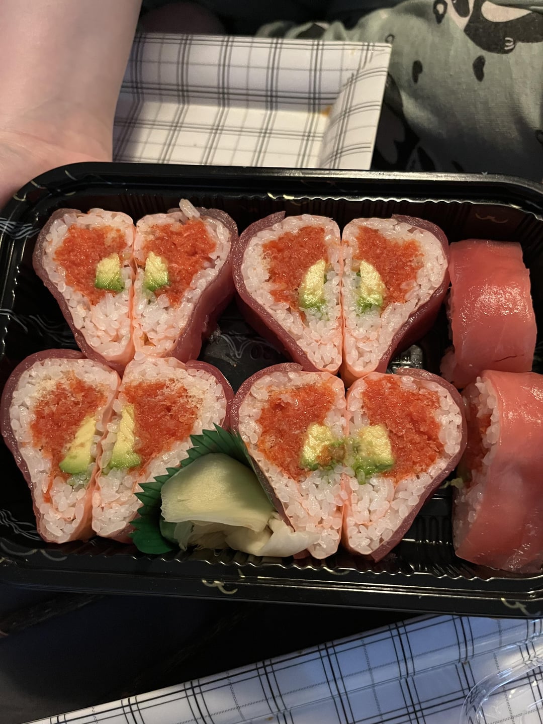A bit too much sauce/extras on the first two rolls but that last one is intriguing. Is that spicy tuna in the middle? Feels like a Valentine’s Day special