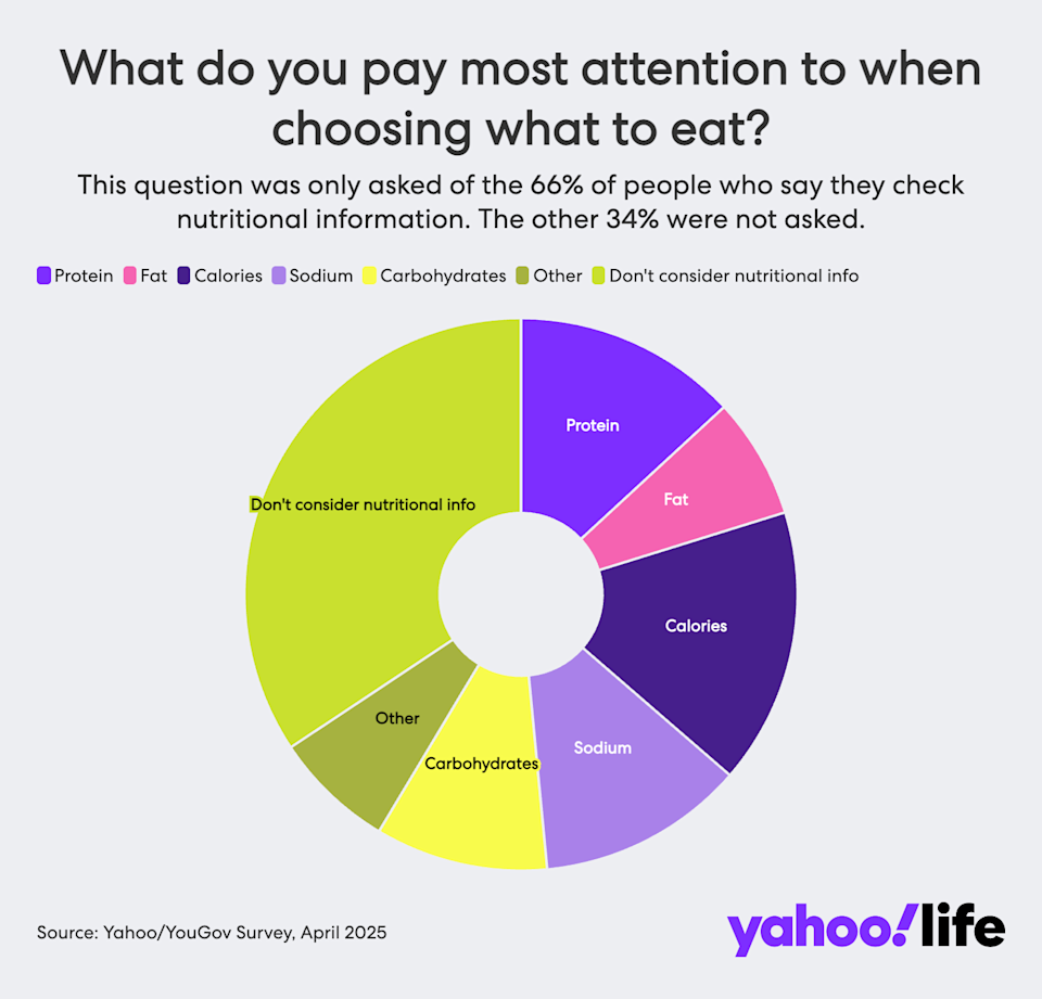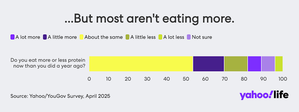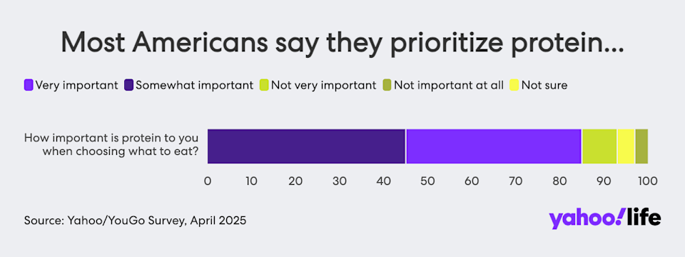 Protein has been having a moment, partly because it’s what some experts have dubbed “the last macronutrient standing” amid the bad raps of fats and carbs. Its connection to muscle building and weight loss — especially in conjunction with GLP-1 medications like Ozempic — has been a further boon to protein. Americans seem to have taken note. A large majority (85%) of respondents to the Yahoo News/YouGov poll said that protein is very or somewhat important to them when choosing what to eat. Yet among the two-thirds of respondents who said they check nutritional labels, only 13% said that protein is the factor they pay most attention to when choosing what to eat. And only about a quarter of respondents said they’re eating more protein now than they were a year ago.