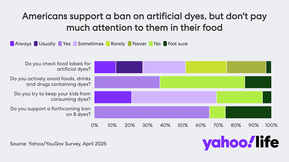 We found the same pattern when it comes to food dyes. More than two-thirds (65%) of respondents to our poll said they approve of U.S. Health and Human Services Secretary Robert F. Kennedy Jr.’s move to ban many artificial colorings. But only 37% of respondents said they actively avoid food dyes, and just 27% said they always or usually check food labels for the ingredients (another 24% said they sometimes check).