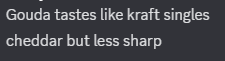 Had a conversation with my buddy about cheeses the other day. This was prompted by my generic hipster dislike of "processed cheese product", but that I had to buy some recently because cash was tight.