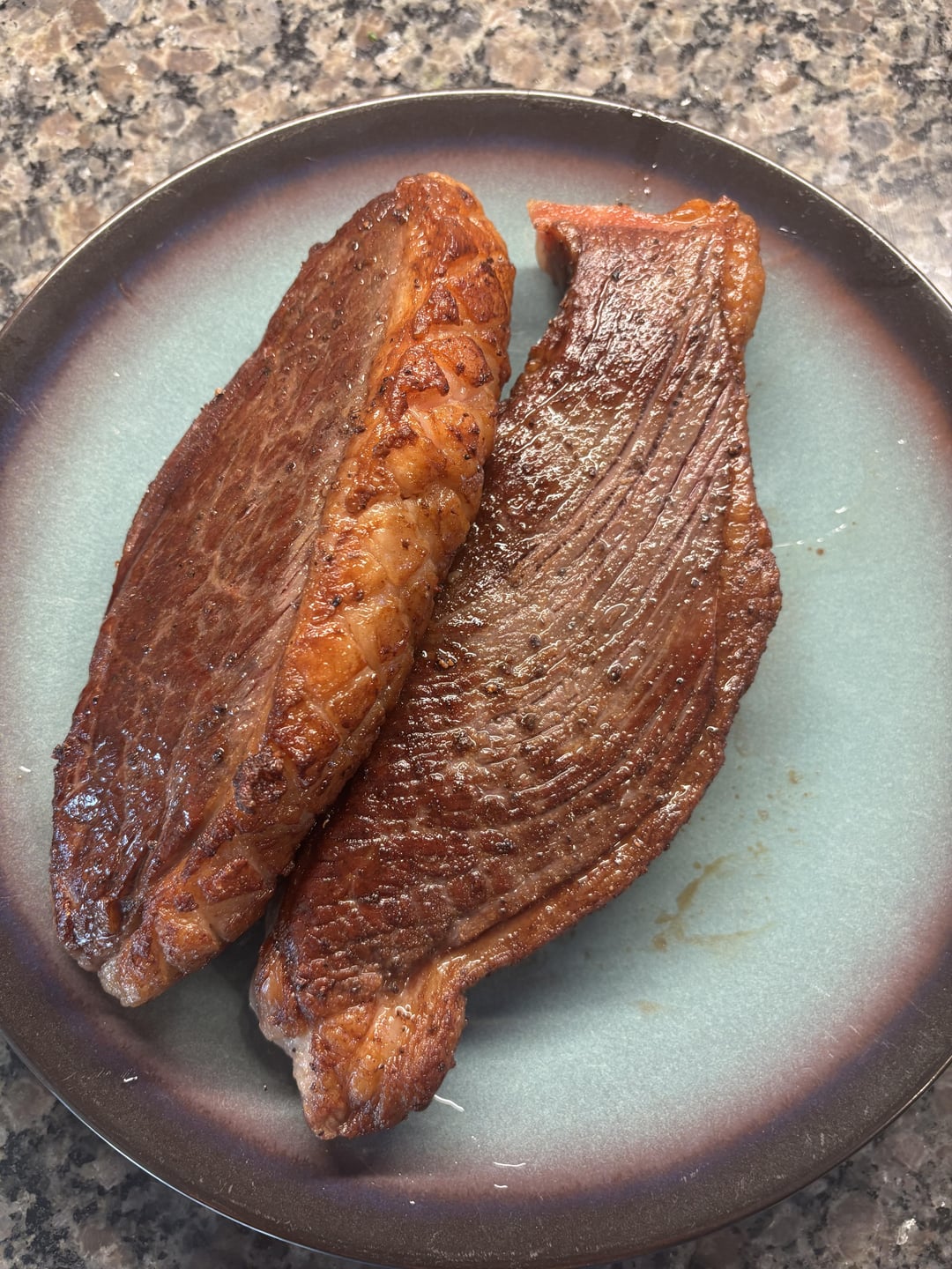 Not my first time eating it, however I’ve been wanting to try it at home but never seen it at my local supermarket until yesterday. They were already sliced into steaks and a three pack was reasonably priced so I went for it. I let these sit overnight after seasoning with a homemade mushroom salt (about an ounce of dried porcini and oyster mushrooms that I ground into a powder and then mixed with about 1/2 Cup kosher salt).
