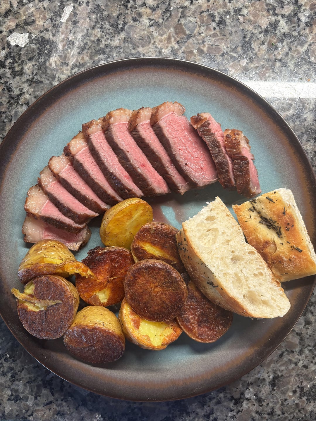 The 24 hour dry brine with mushroom powder and salt is pretty much my standard way to do steaks, it almost gives a dry aged flavor to them. Served with simple roasted potatoes, rosemary focaccia and chimichuri. This steak was amazing.