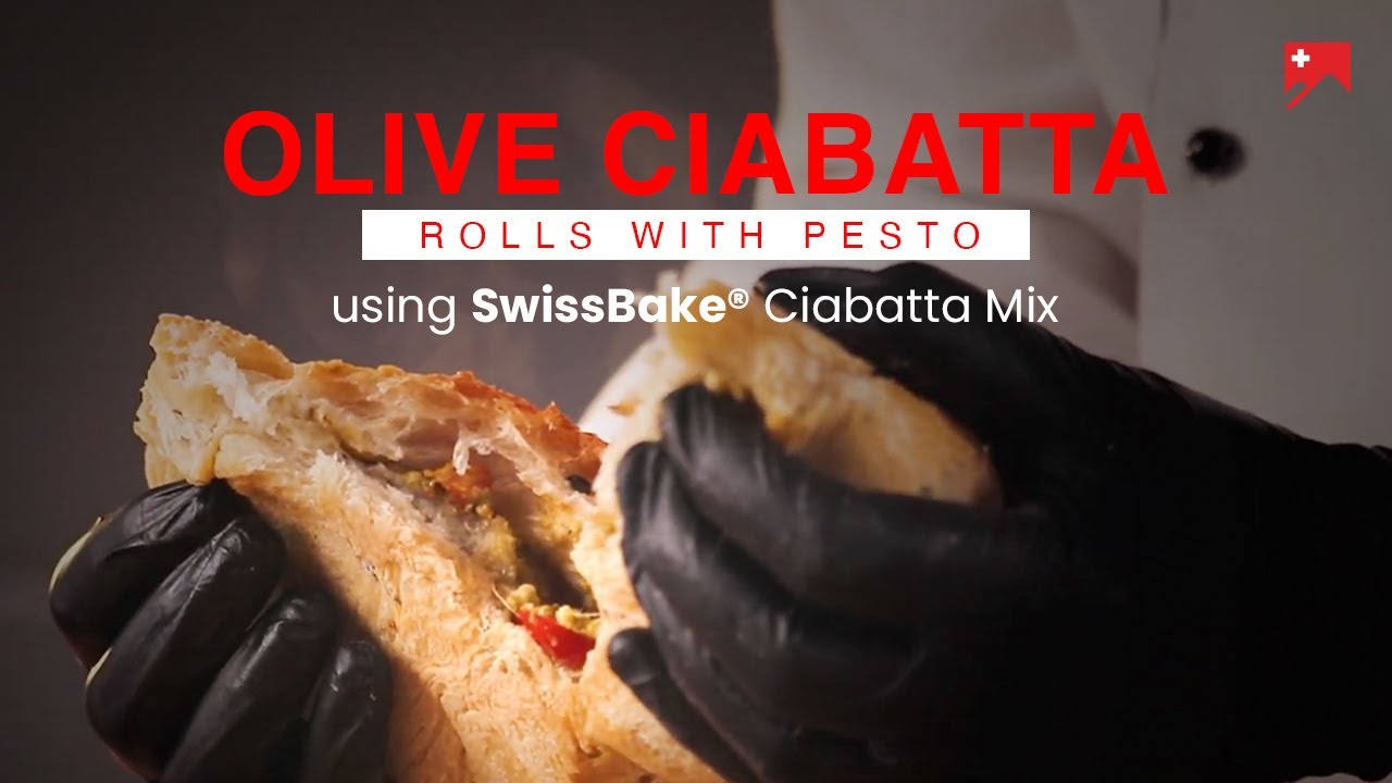 Create artisanal Olive Ciabatta Rolls infused with fresh pesto — using our SwissBake® Ciabatta Bread Mix designed for commercial bakeries, gourmet menus in hotels, cafes and foodservice kitchens.