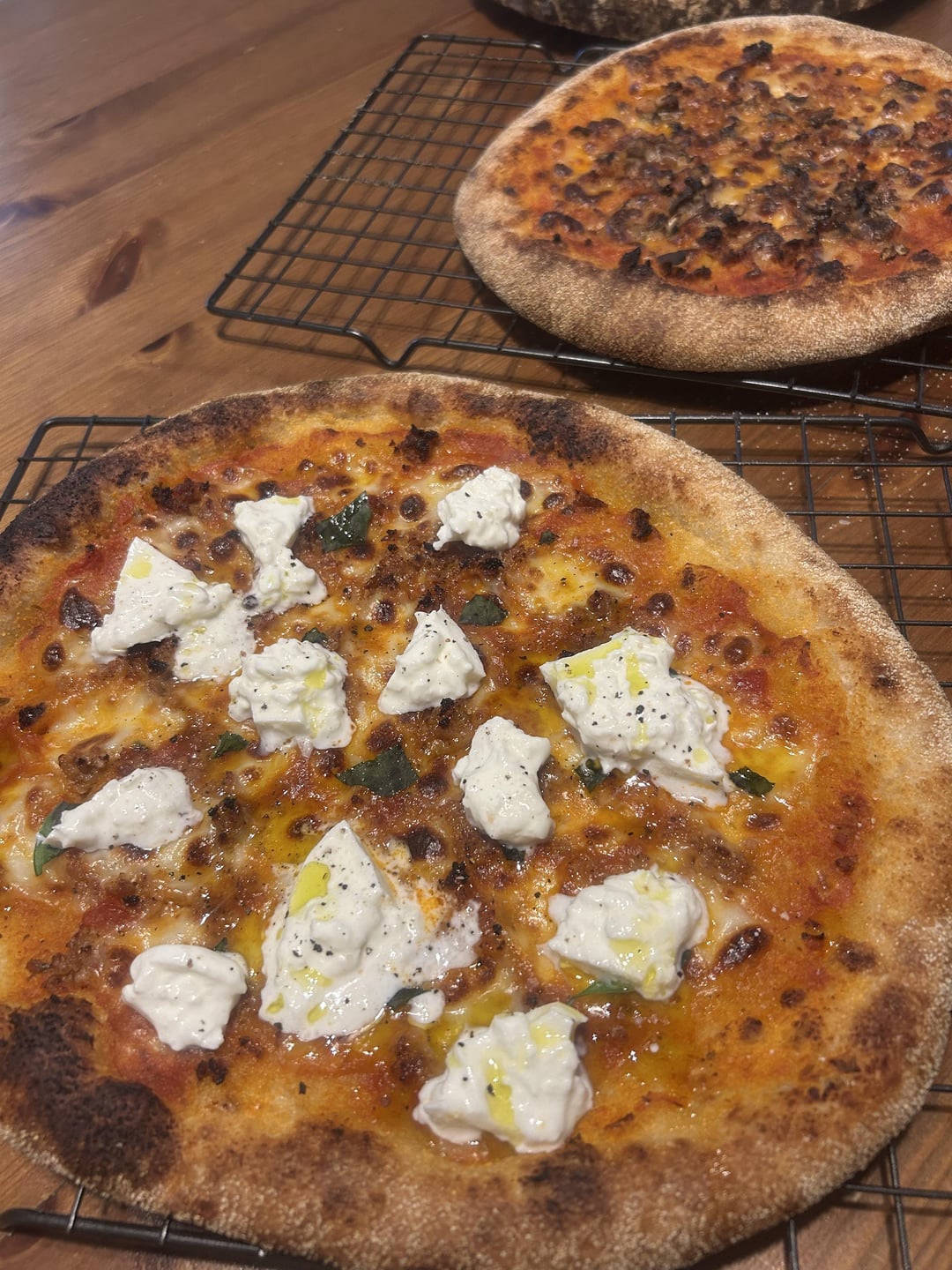 Pizza making has become one of my favorite pastimes recently. I think this is my best one yet by far. Garlicky marinara with crumbled italian sausage, fresh mozz, fresh basil, and burrata with olive oil and a crack of pink salt and pepper. Just insane.