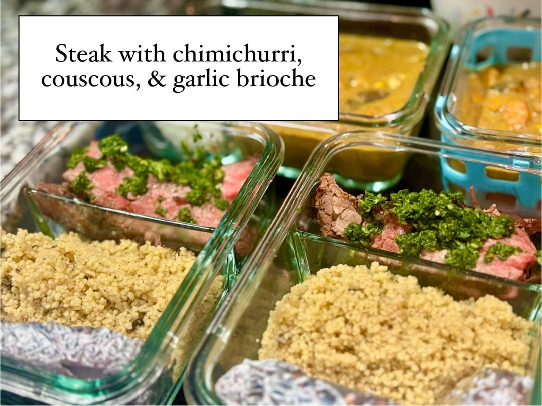 (3) Medium flank steak with chimichurri sauce, couscous, and garlic brioche toast (in foil): Another RecipeTin recipe and it was GOOD.