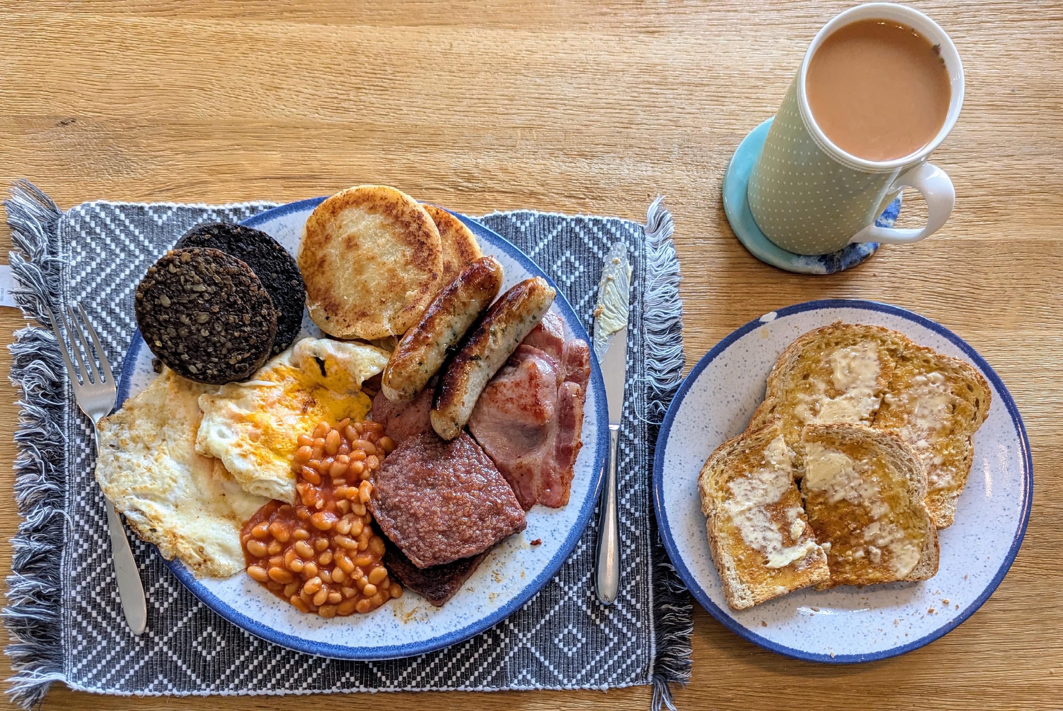 You lot have been a bad influence. All the meat is from the butcher, usually have local eggs but not today. Almost forgot the beans, wanted clootie dumpling but couldn't get it, and could have done with one fewer tattie scone. But not bad considering I normally do veggie cooking.