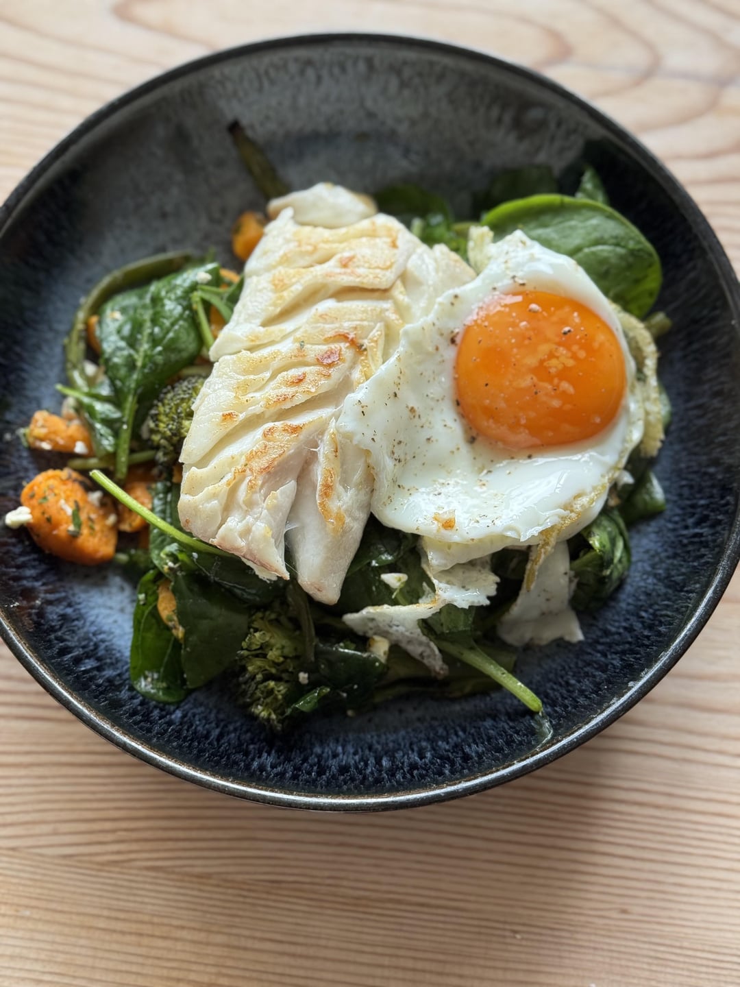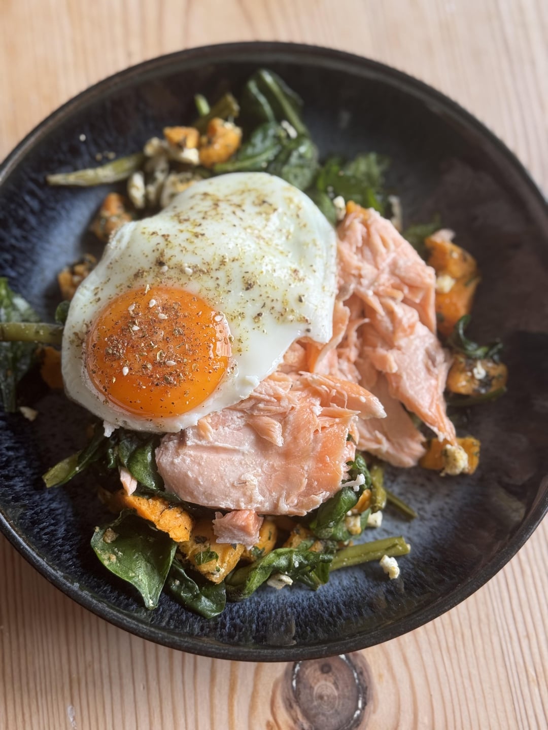 I prepped a base salad (roast sweet potatoes, roast garlic, spinach, green beans, broccolini, low fat feta, fresh mint and parsley) and I’ve been adding different toppings each day for lunch. Here’s a version with hot smoked salmon and a za’atar egg, and one with pan fried cod and a fried egg. Tomorrow I think I’ll add a hard boiled egg and smoked tofu!
