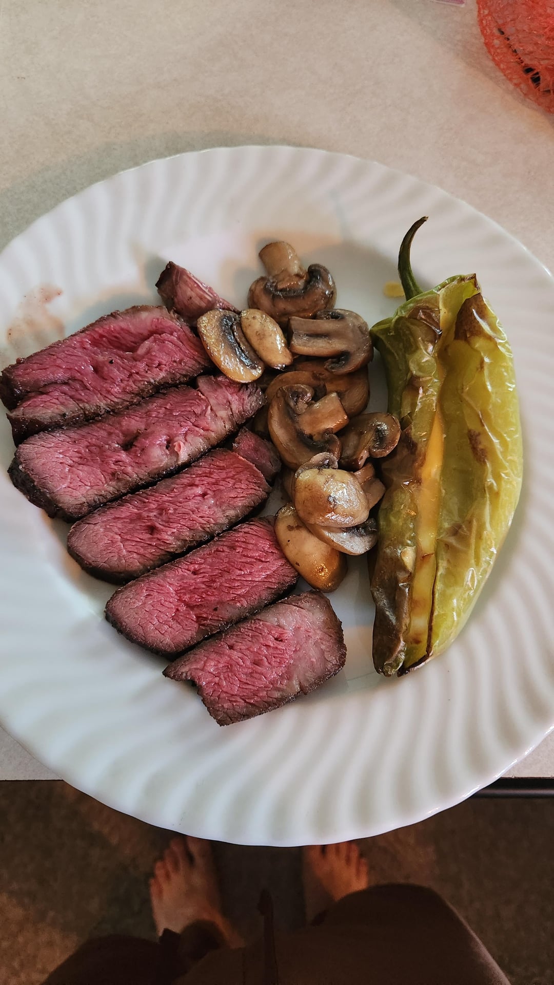 Just a chuck steak, but flavor was amazing. Cooked on convection in the air fryer then finished with a big flame. Served with Anaheim Peppers, stuffed with cheddar and cream cheese then roasted, and mushrooms sautéed in butter amd garlic.
