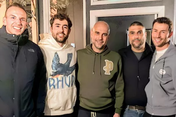 Manchester City manager Pep Guardiola pictured at Vero Moderno Italian restaurant, with Blues coaching and medical staff. He’s pictured next to Vero Moderno owner Beppe Piccoli in the dark blue.(Image: Vero Moderno)
