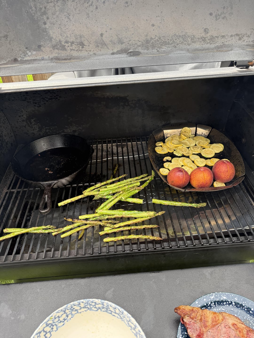 Ribeye, zucchini squash, asparagus and peaches for dessert. Definitely have some learning but appreciate all the feedback from you all. $100 and some elbow grease well worth it