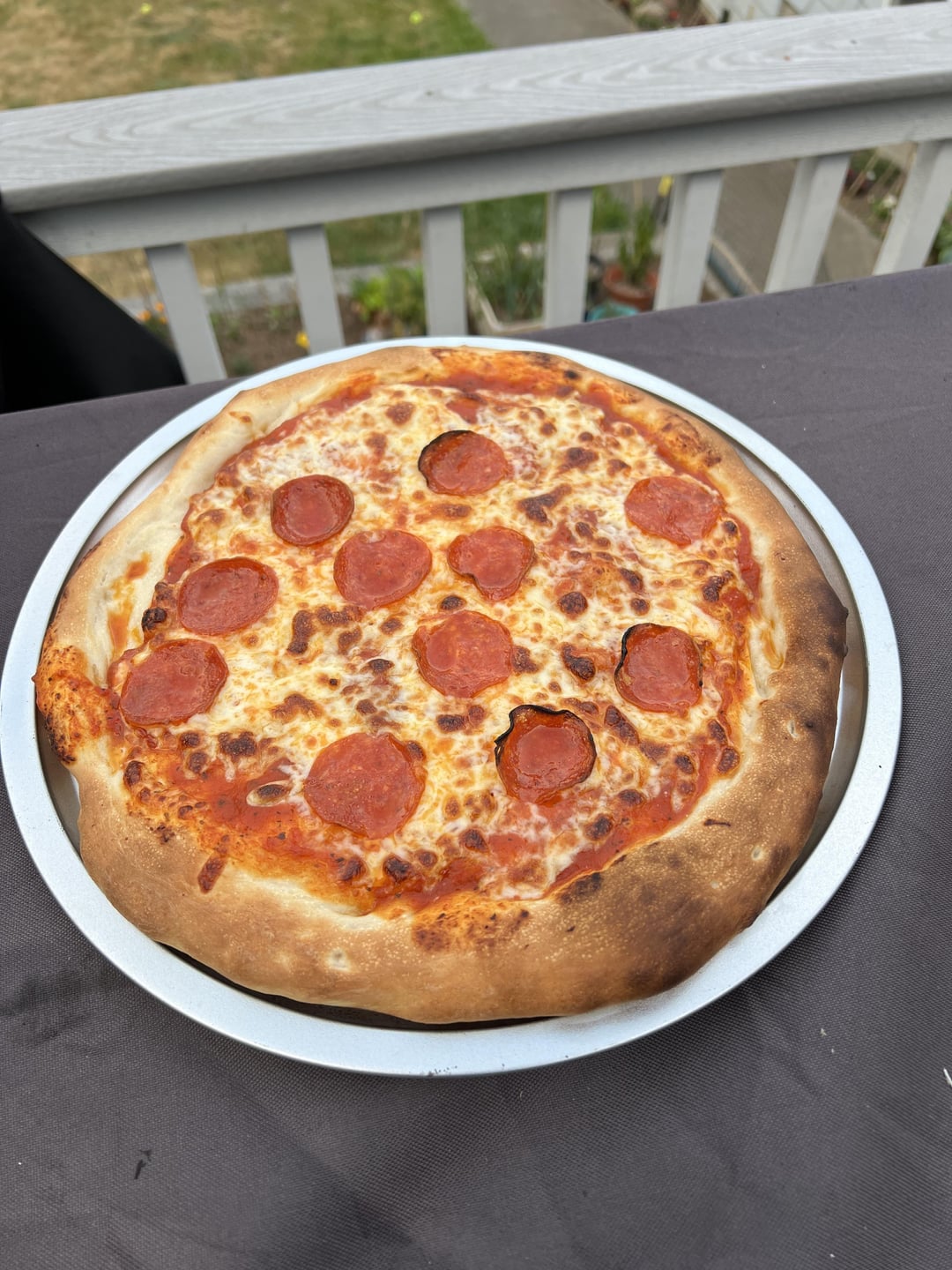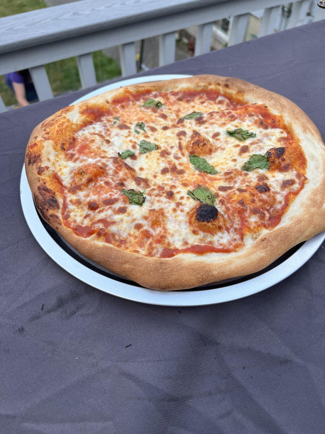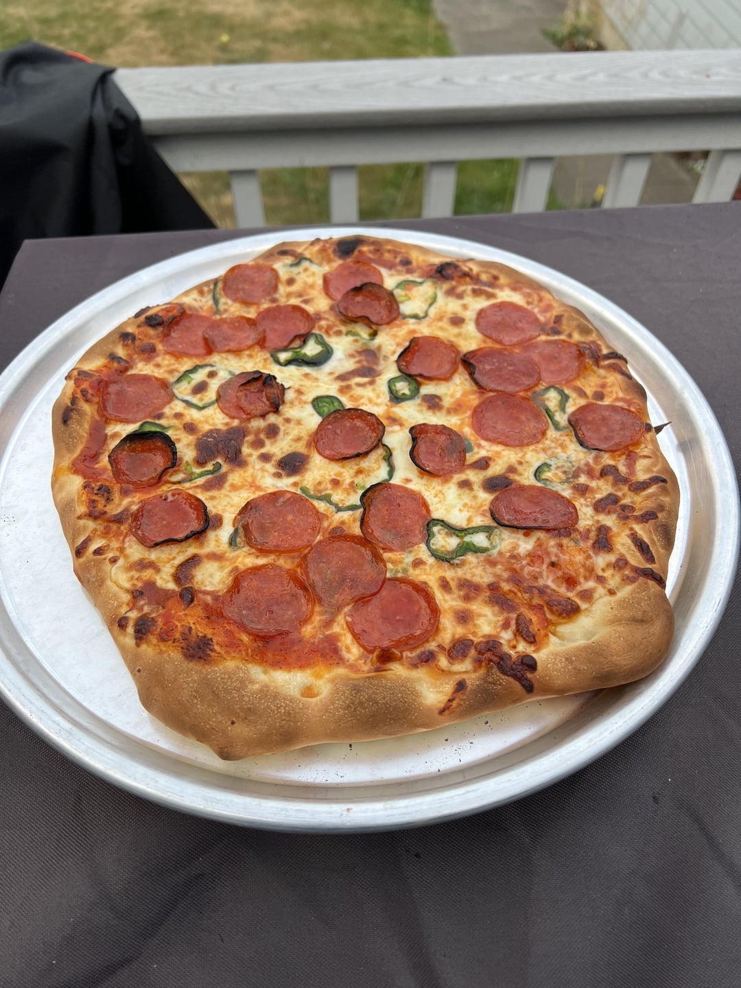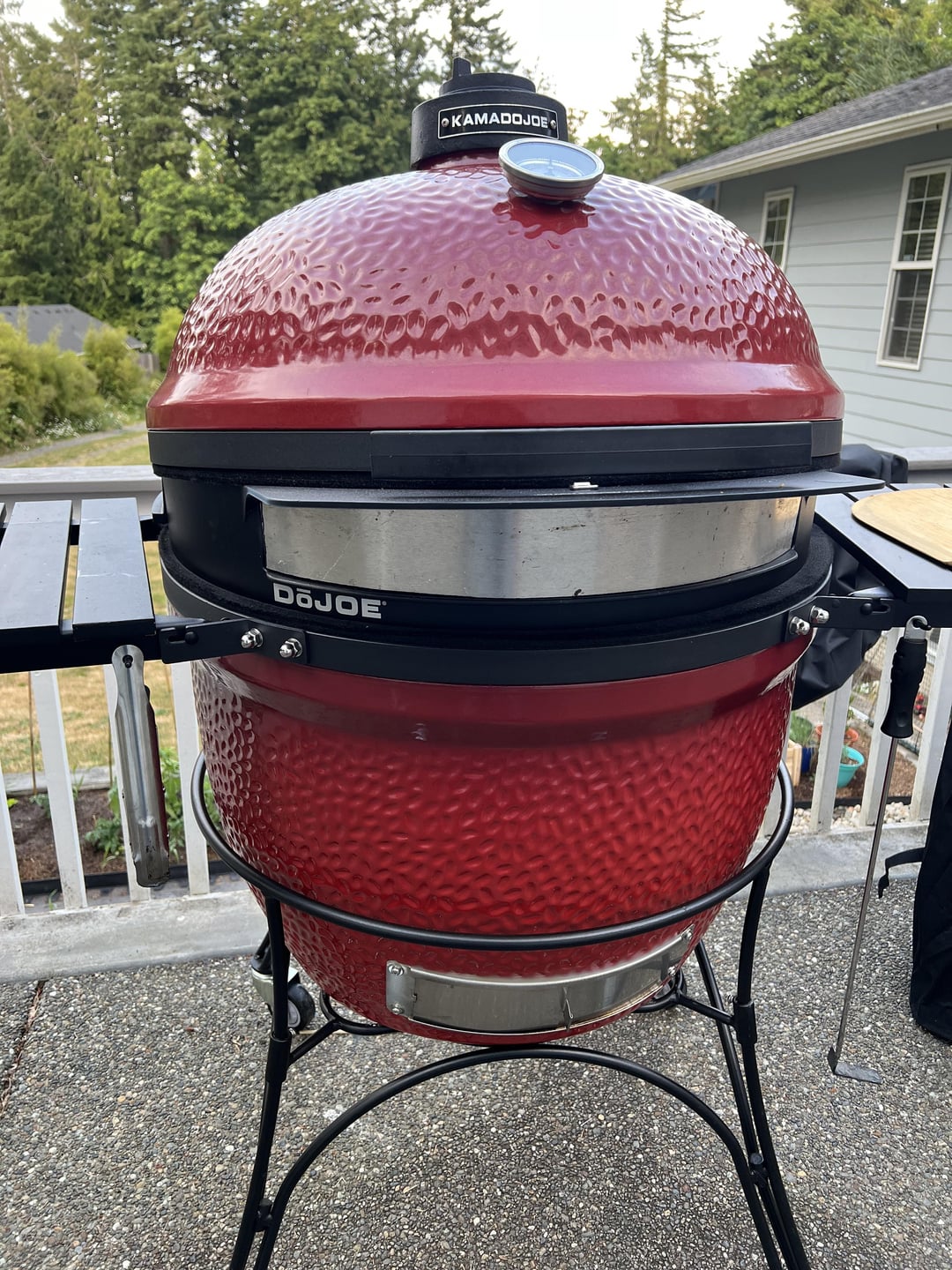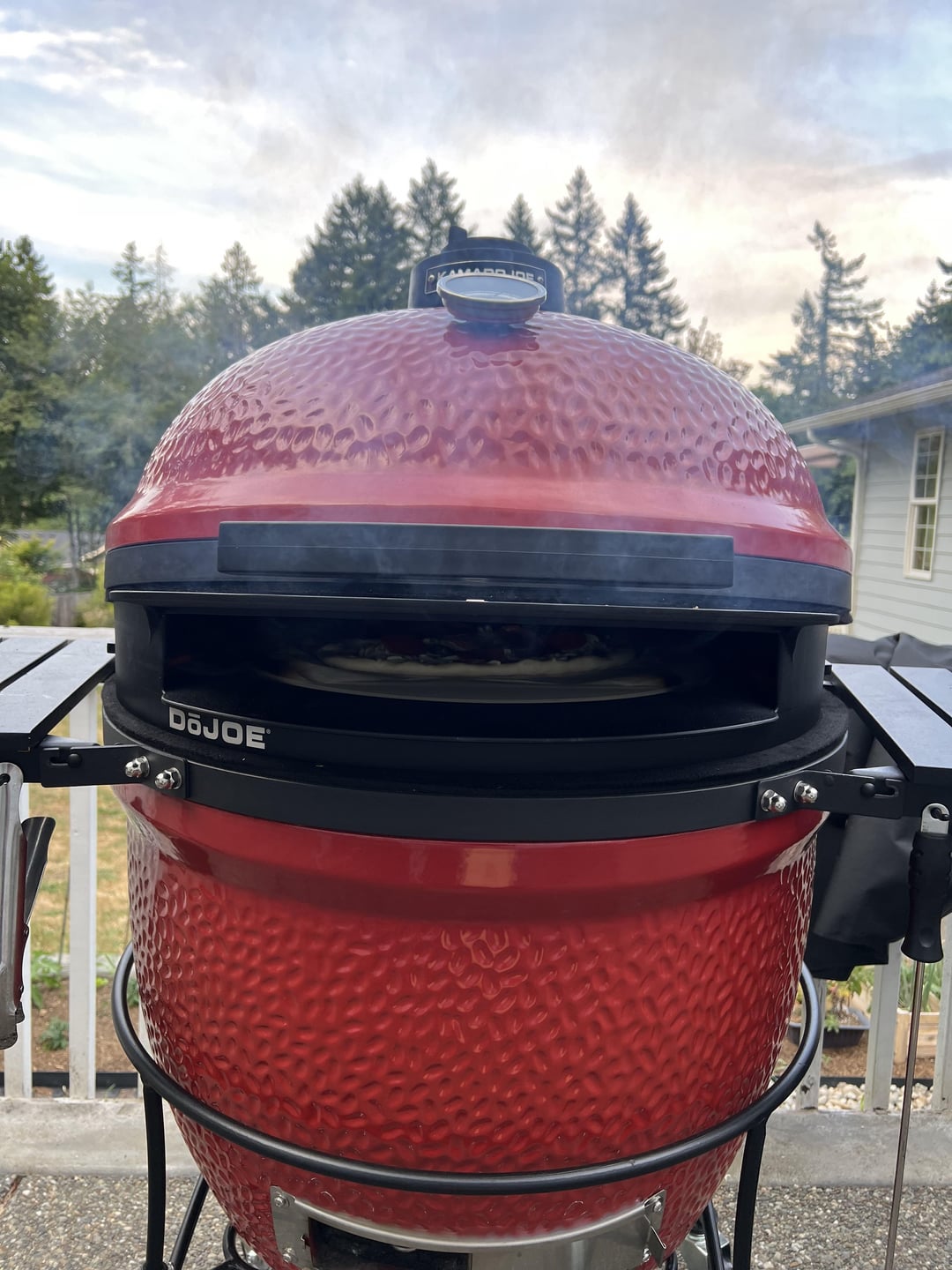 So I picked up a “used” dojoe off Amazon for my big Joe for $110. This thing is awesome. It got up to 700° relatively fast and held temp for cooking 3 pizzas. I really like it. These are the best pizzas we’ve ever made! I also made a crude aluminum door to place on the opening to try and save to coals. I read a bunch of reviews about wasting the coals and I really did not want to try and pick up the big dojoe when it’s screaming hot!