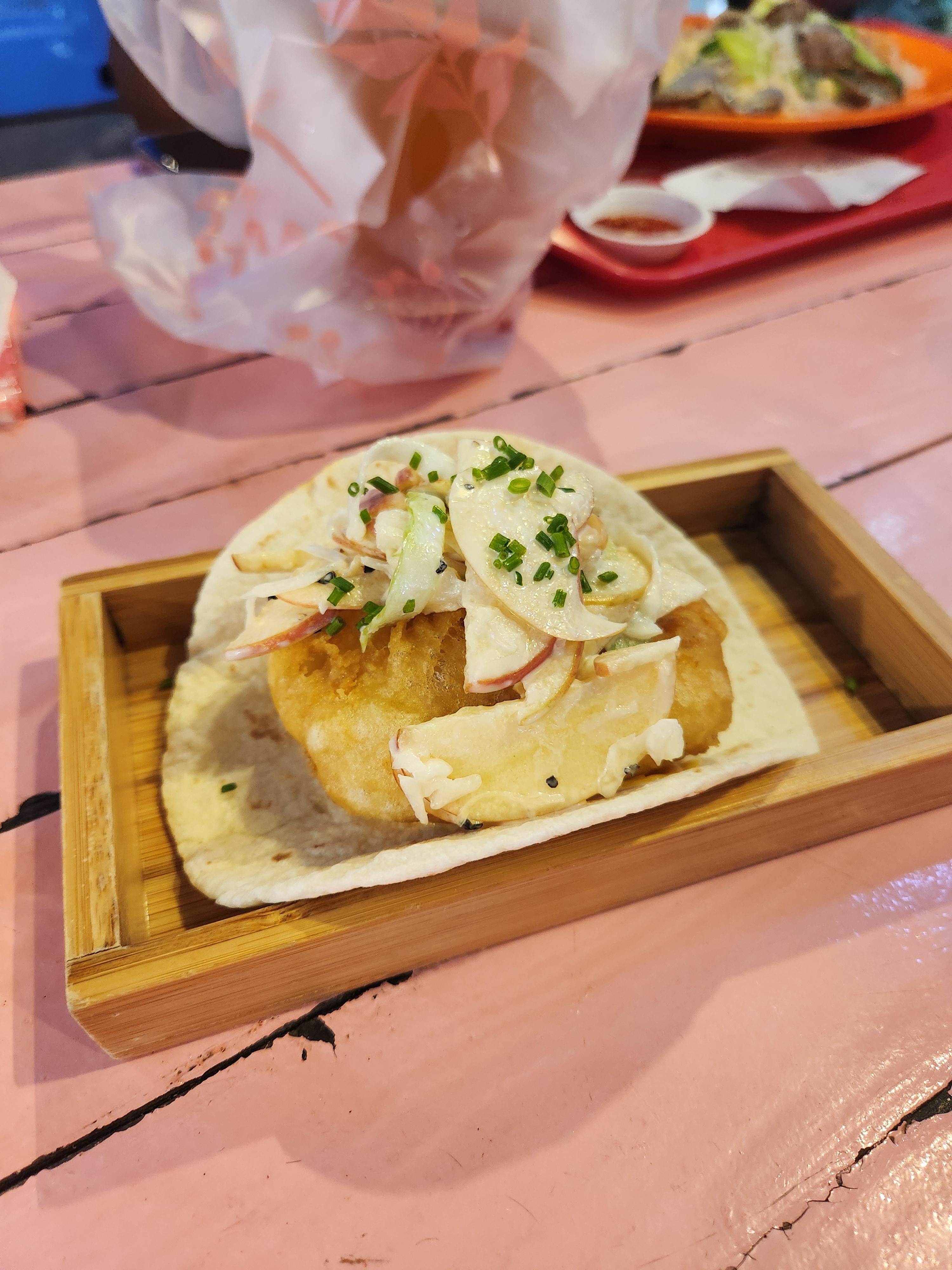 It's a fish taco served from a food trailer stand.