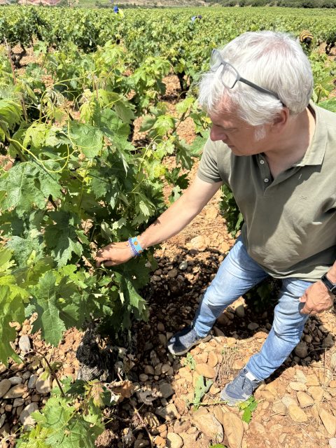 González inspecting vines near the Viña Salceda winery.