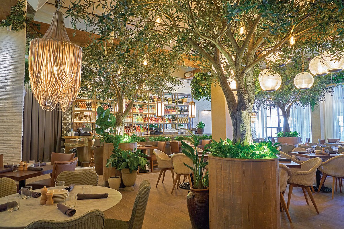 Located in the posh Bal Harbour Shops, the spacious restaurant aims to evoke summer in the Mediterranean coast. Numerous full-sized olive trees, climbing ivy and hanging plants create a feeling of having arrived at a picturesque farmhouse garden. Gold Moroccan light fixtures and Parisian streetlamps provide warm light and French-style doors open up to a wonderful patio for those craving alfresco dining.