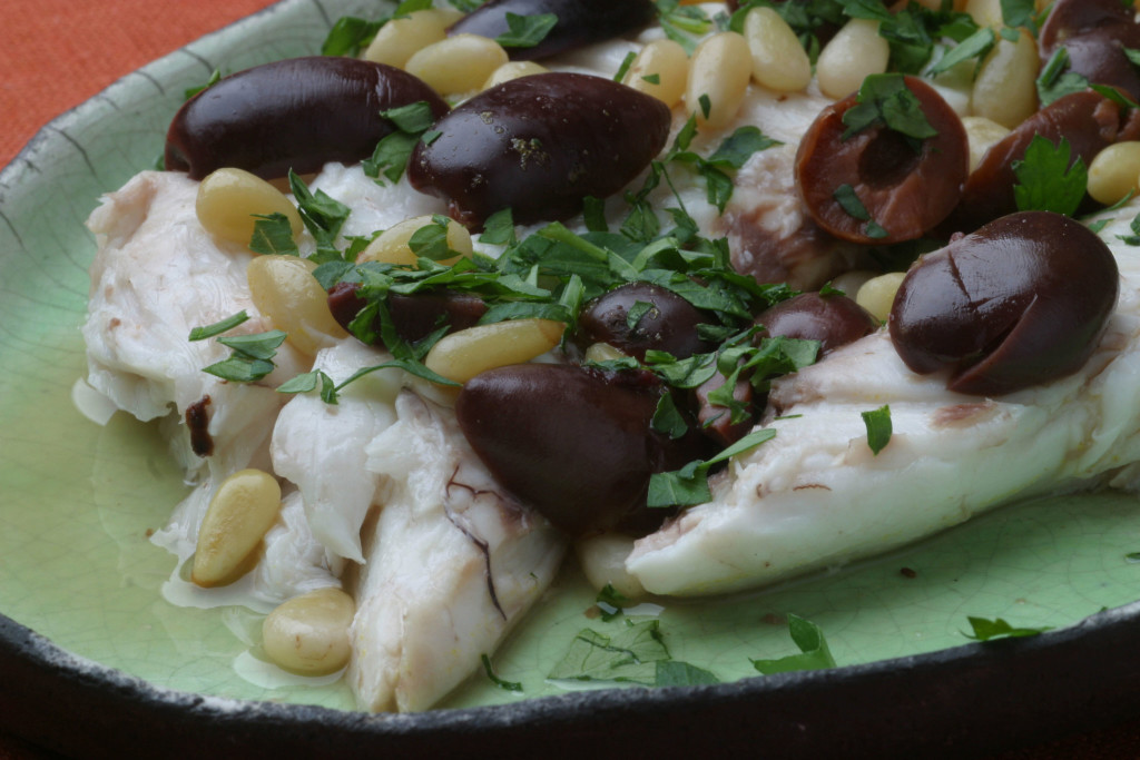 3. About 15 minutes before fish is ready, place Seville orange juice (or orange and lime juice) in a small saucepan. Add remaining bay leaf, olives and pine nuts. Place over high heat to bring to a boil, then reduce heat to low. Simmer uncovered for 5 minutes. Remove from heat, cover and keep warm.