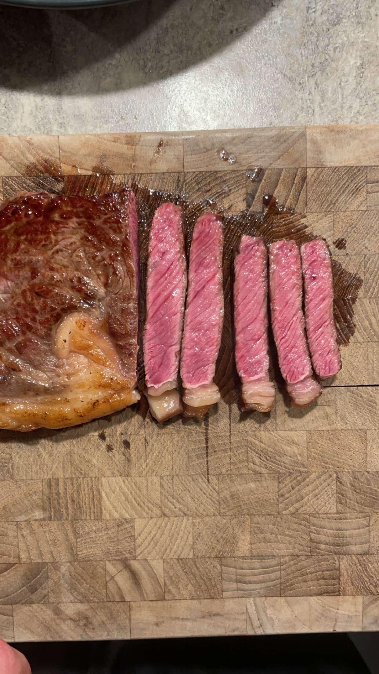 Oishi-Niku 7 months ago Sous Vide? Its perfectly done but the crust is lacking. Pat it dry and get that pan screaming hot before finishing it.