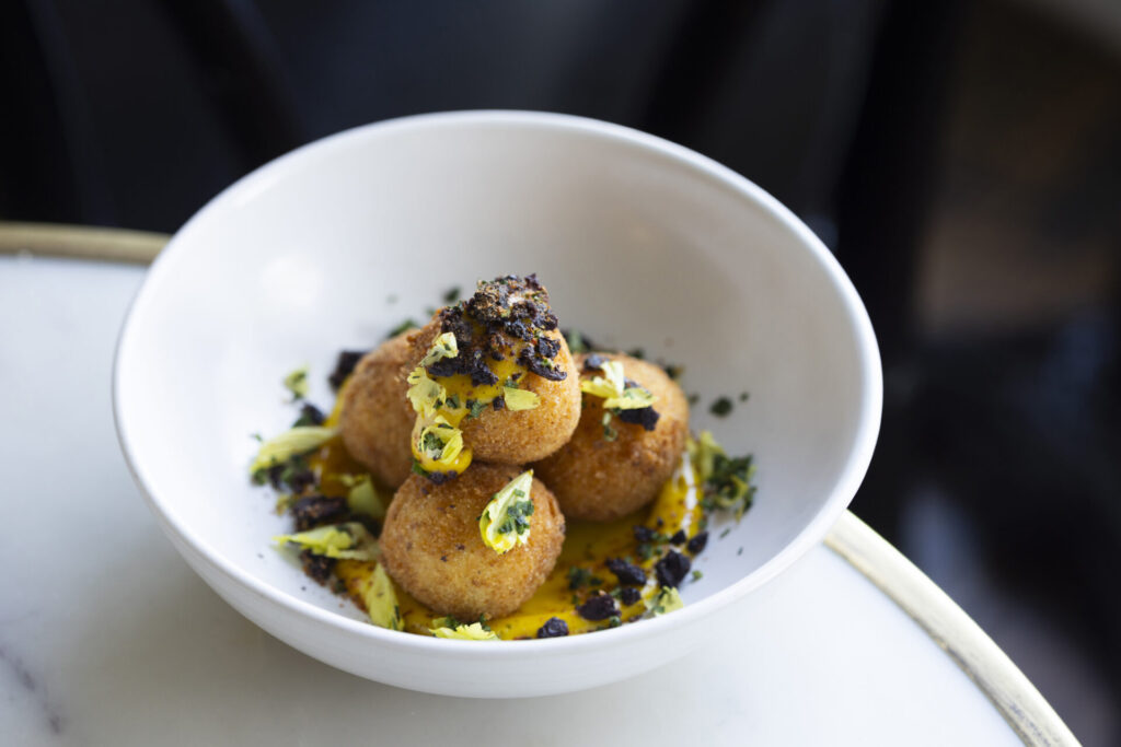 And then, naturally, appeared a parade of dishes, a problem of my own making. The pear and blue cheese salad over kale and cracked wheat berries from Iron Ox Farm had an orange-date dressing. Valleyview Farms’ Topsfield Tuffet, an aged goat’s milk cheese, was served alongside slivers of baguette and peachy-green Muscat grapes. A savory tartine of thinly sliced Tasso ham and raclette cheese had a spicy Dijonaise undercurrent. Crisp cubes of pork belly were lacquered with a sweet soy glaze. My guest and I ate them with kimchi, purple ube potatoes, and an Iron Ox Farm Macomber turnip purée.