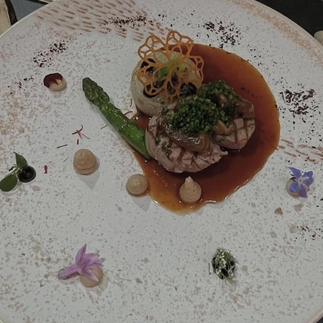 Limousin Veal: The veal was cooked perfectly, but completely unseasoned. The jus-vanilla sauce was sickening due to the vanilla. The asparagus was just grilled asparagus. The artichoke purée dots were flavorless. The onion with veal in the middle and a soy sauce reduction wasn’t bad, though.