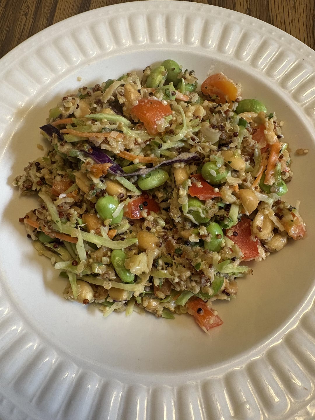 It’s something that probably only tastes good to me, but it’s: quinoa, edamame, jalapeño, Serrano, and bell peppers, carrots, broccoli, red cabbage, garlic, peanuts, coconut, sesame seeds, cilantro, mint, tahini, maple syrup, soy sauce, and lemon juice.