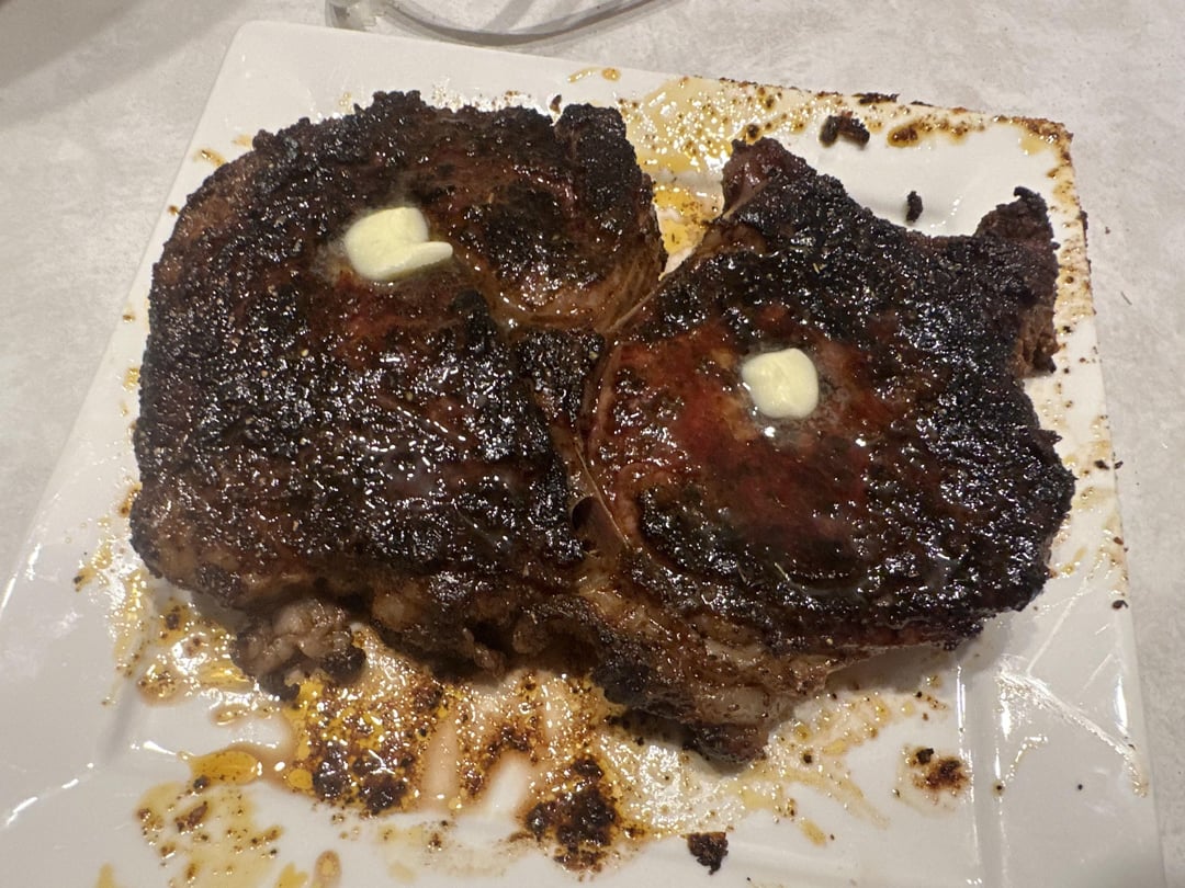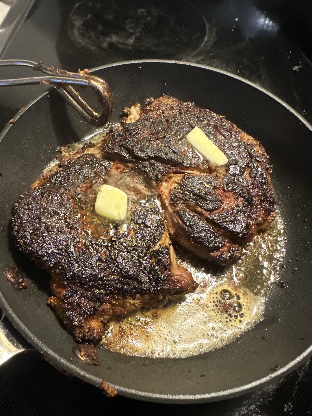 If you like butter on your steak try compound butter. Soften your butter, add things like garlic or roasted garlic, thyme, parsley and refrigerate again till it’s hard then cut little blocks and add to the top of your steak when it’s finished. But great job! Maybe let it rest and put on a new plate when finished.