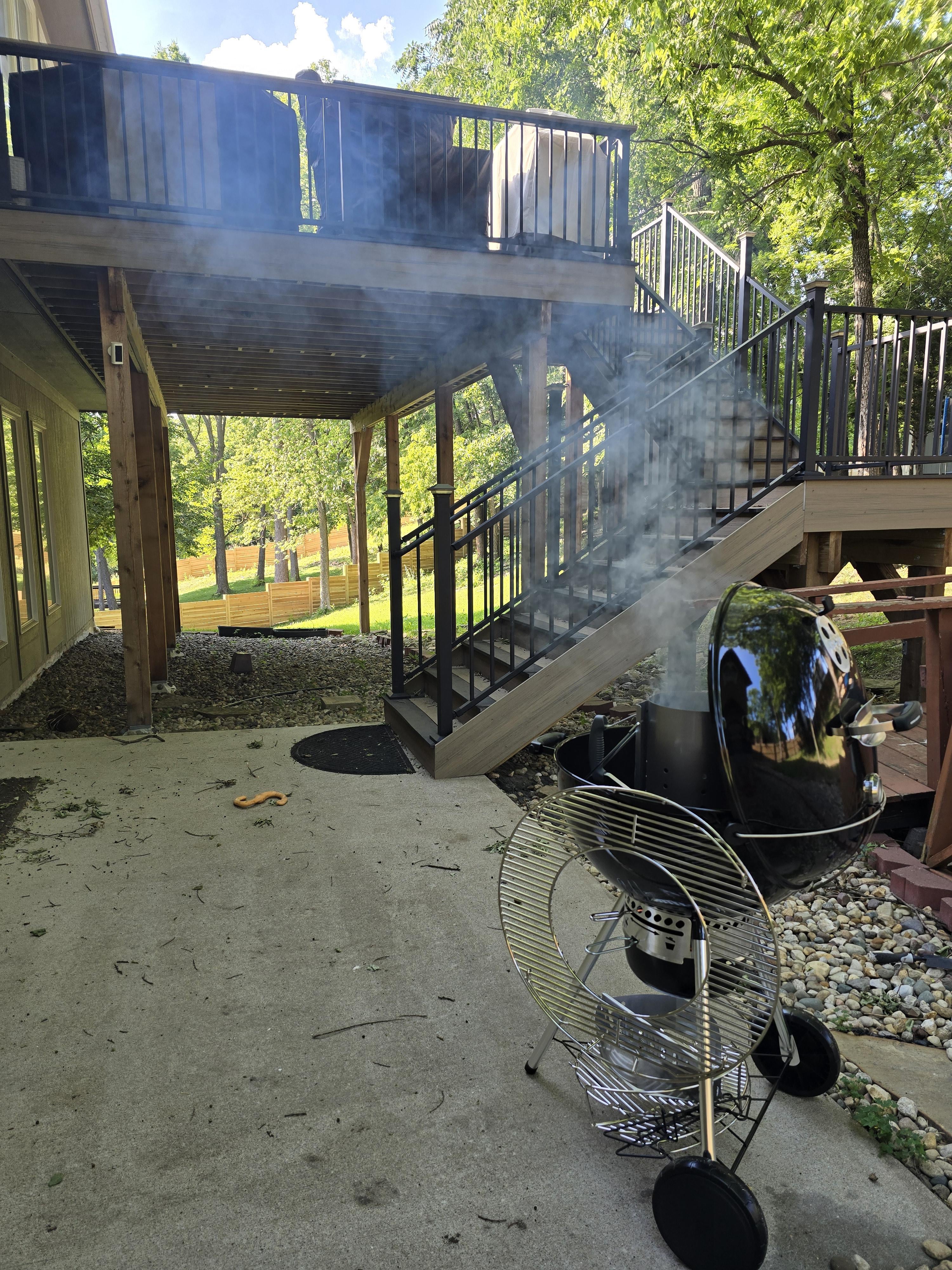 I've been wanting to get a Weber Kettle for a few years now, and finally pulled the trigger on the Master Touch 22! The wife thought 3 grills were enough (Rectec pellet smoker, Blackstone griddle, and basic 4 burner Cuisinart gas grill) 🤣. I did feel a little bad putting it down on the patio, but considering I just built our new deck a little over a year ago, I didn't want to end up with melted composite deck boards! Cooked up some burgers, dogs, and corn on the cob tonight and they were phenomenal! Definitely hit the spot on that flavor I've been missing out on! Can't wait to do some wings next!