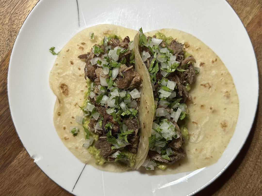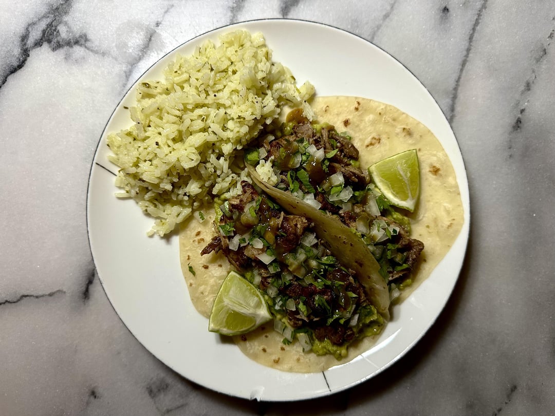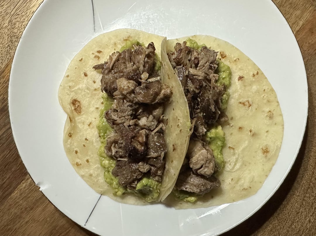 Tacos for dinner last night. Crispy sous vide carnitas , seasoned smashed avocado, diced onions, cilantro, lime, and a mango verde hot sauce on Sonoran style flour tortillas. Carnitas cooked 24 hours at 155°. Served with some cilantro lime coconut rice.