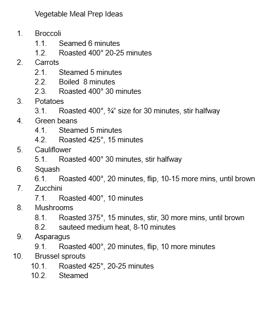 Sometimes I see vegetables on sale at the grocery and just buy it without a recipe in mind. When I meal prep I mainly prep the vegetables for the next 3 days so dinner is easier to get on the table for those nights and lunches. I grew up having a salad, meat, 2 veggies and a starch everyday. So I do the same minus the salad. It just doesn't taste as good as my moms. Here is my list of how long to cook certain veggies. I add seasonings that I like and have on hand. For Broccoli I add a pinch of crab boil to the water. My son is liking honey carrots so I'll add butter and honey to the boiled carrots. My go to for asparagus is add oil, garlic and Tony's seasoning. I pretty much keep it simple with oil, cajun seasoning or Tony's seasoning and some kind of flavor like lemon or parmesan or any other flavoring.