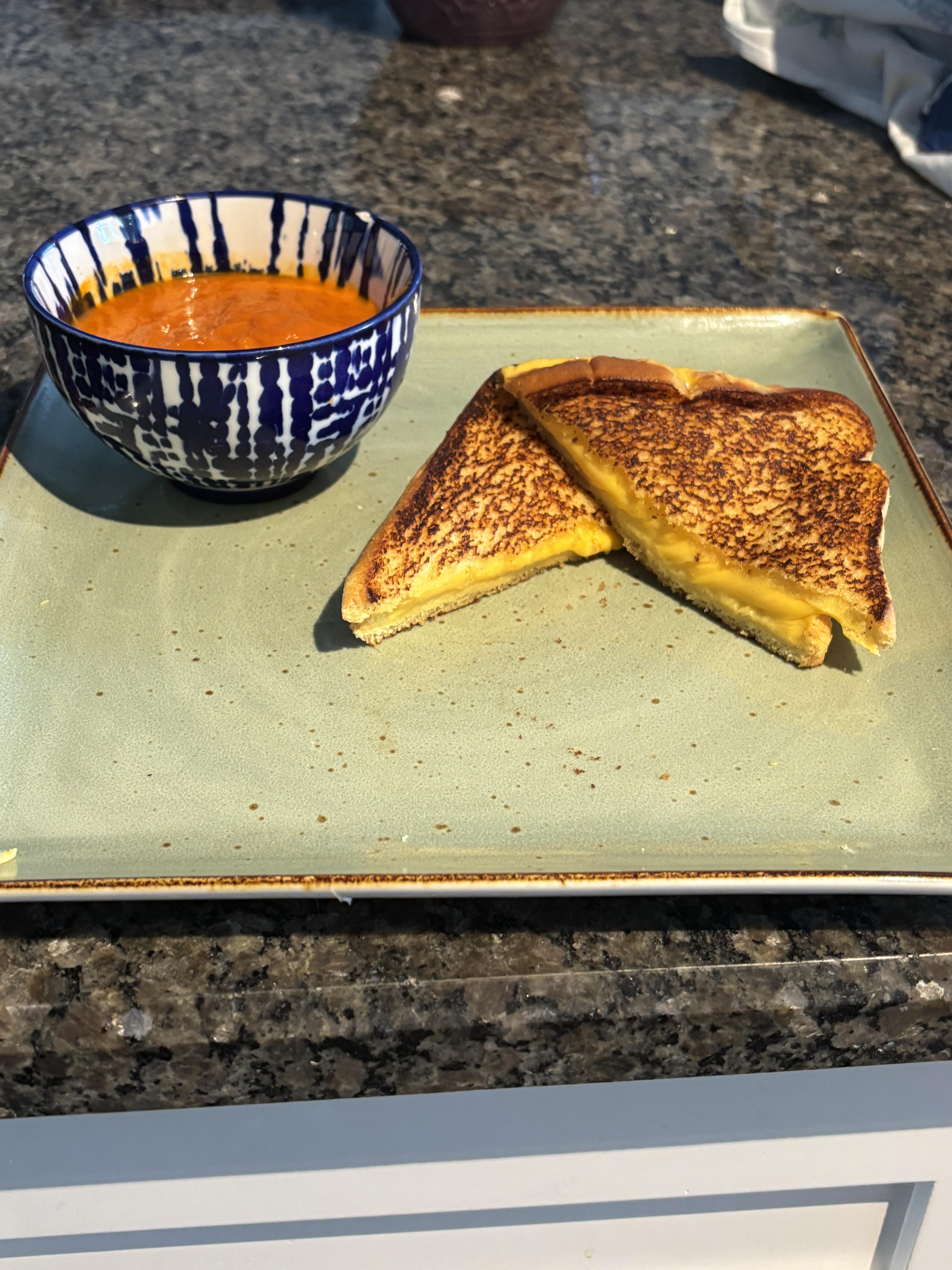 I’ve been perfecting GCs for a long time. This iteration is on Martin potato bread, Aldi brand American cheese, and I use Mayo as a catalyst for browning. Always start in a cold pan, 3:45 on the first side, about a minute on the other, with a lid on for perfect browning and full meltage 😁 served of course with a side of tomato bisque. I submit for your judgement!