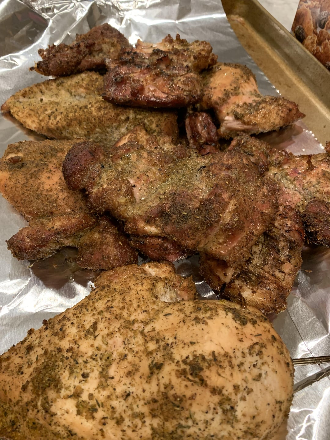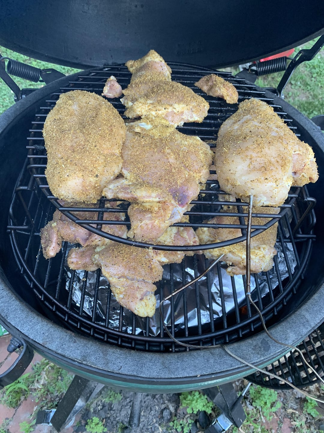 Mix of skinless breast and thighs. Used Montreal chicken as the rub with a bit of oil. Fogo for the lump, with 2 apple chunks and 1 pecan from Smokey woods. Indirect at 230 for the first two hours until I got impatient and brought it up to 300 for the last hour. Pulled at 160 for breast and 180 for thighs. Shredded after resting another 30 mins and served with sweet baby rays on a bun. I'm going to freeze the rest without sauce to try in other dishes like tacos.