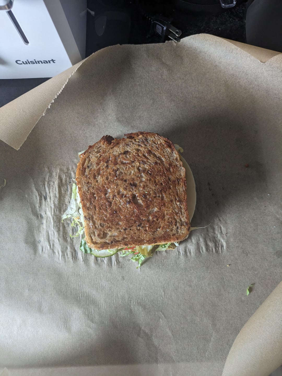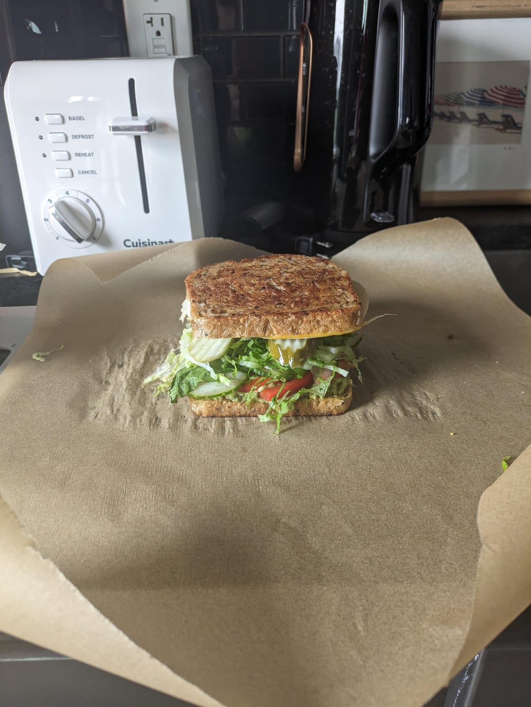 muenster, turkey, pesto (grilled with mayo on outside of bread), added avocado, fresh bell pepper, cucumber, romaine shredduce, grillo's pickles on seven seed sourdough 😀