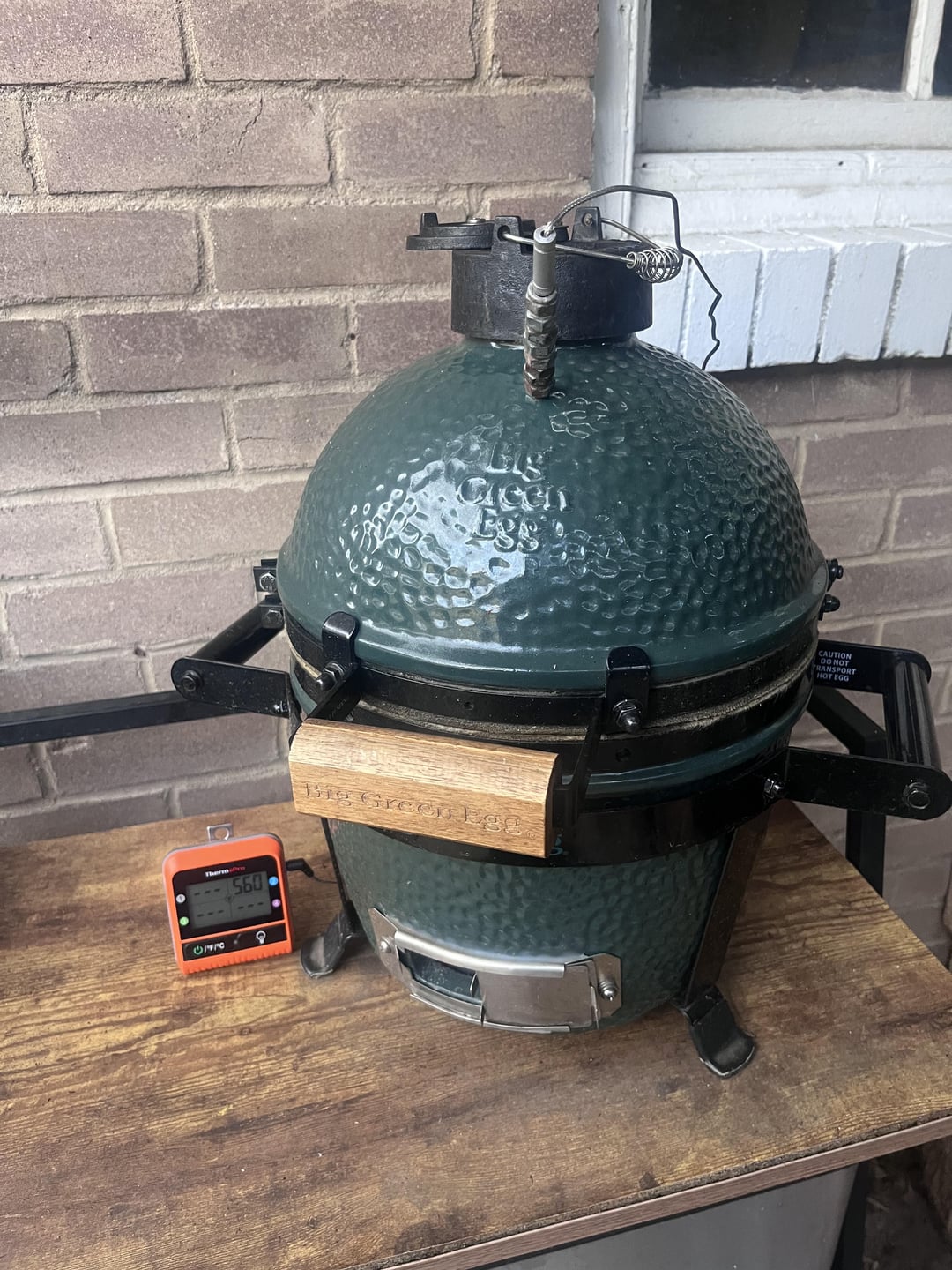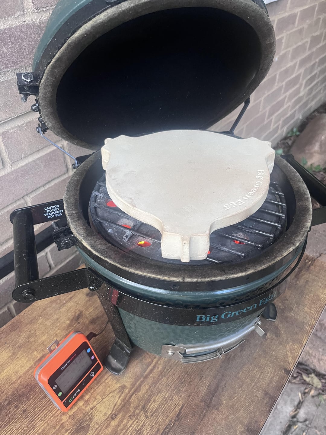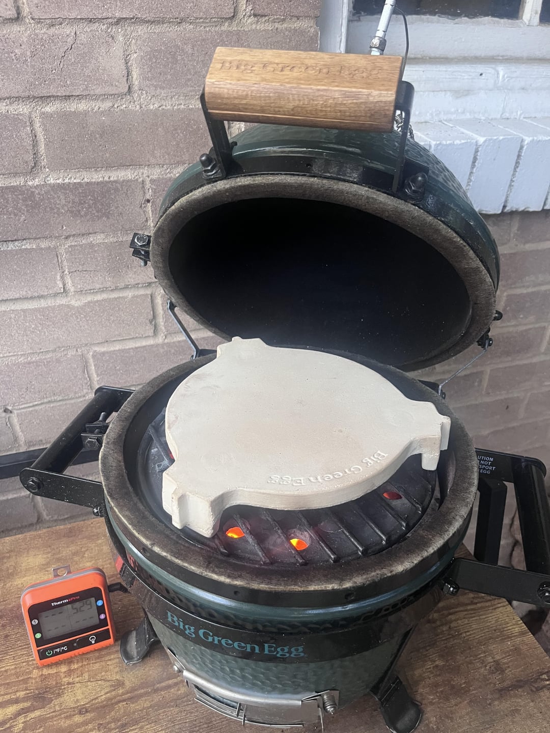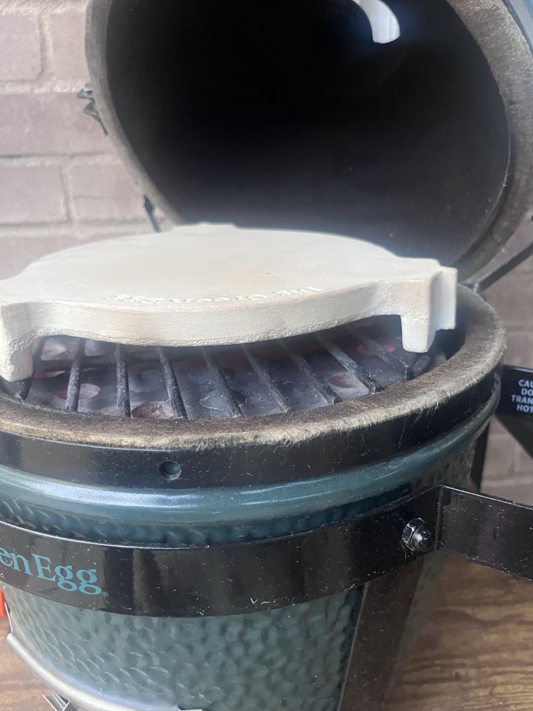 The “deflector” below the cooking grate is a cracked fire grate from the large egg that I used furnace cement to repair and fill the center holes of, which is the perfect size for indirect on the mini.