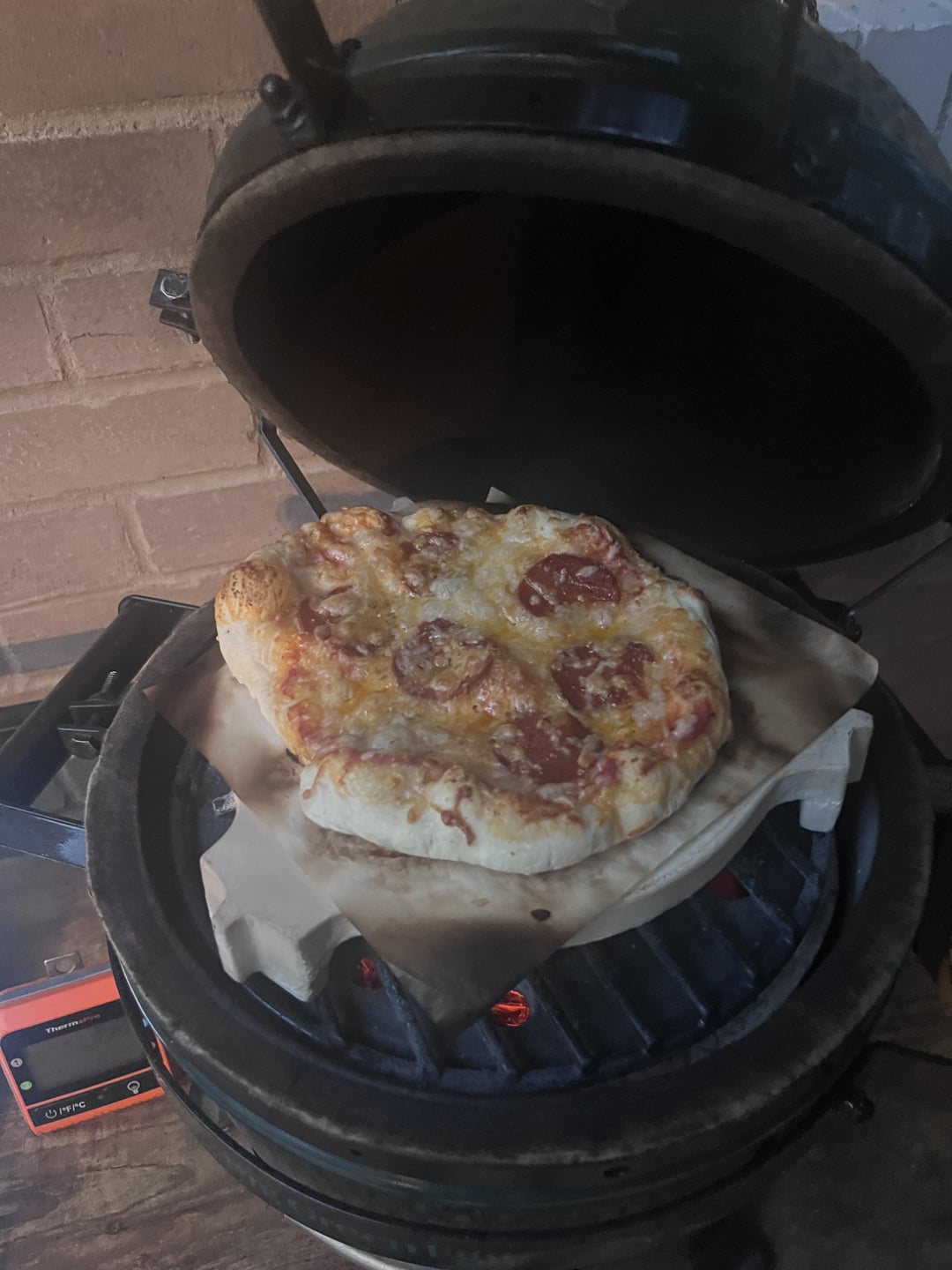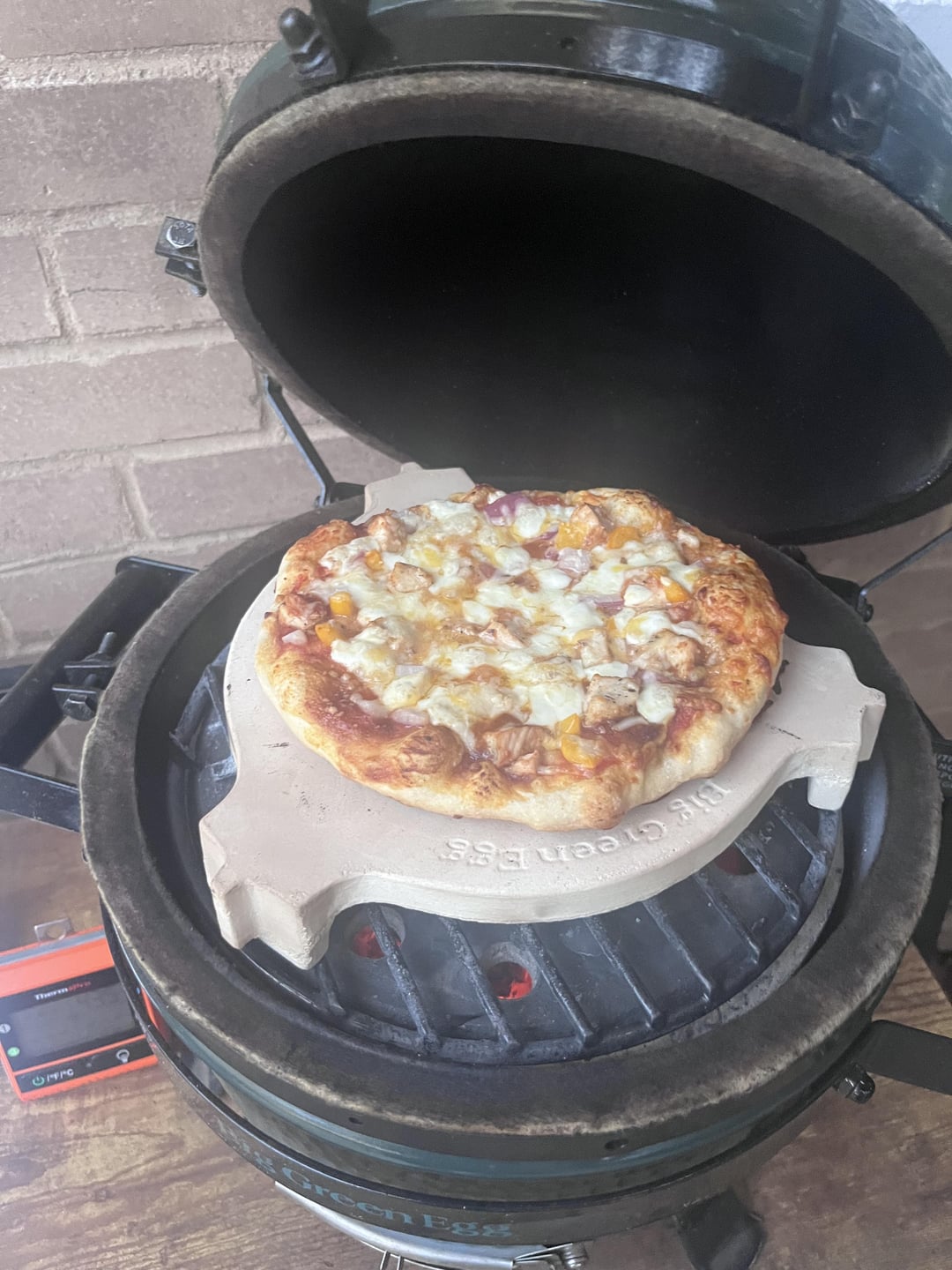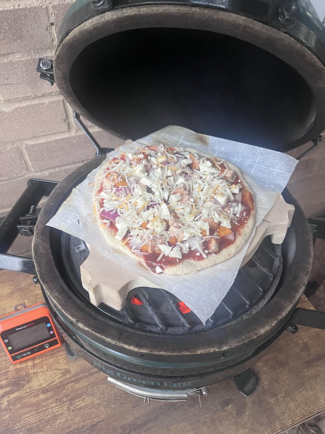 This cook was long overdue. I’ve owned this mini since 2009, but just got a conveggtor for it and tonight was the first time making pizza on it. Preheated to ~550f for 45 mins while prepping a BBQ chicken with red onions+bell peppers and a classic pepperoni.