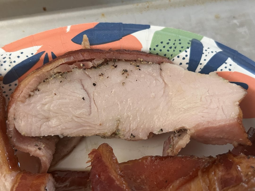 Turkey tenderloin (from Walmart). Seasoned with a garlic pepper seasoning I picked up locally. Wrapped in bacon for flavor although the bacon was decent too! Smoked at 225 for an hour, turned up to 300 until IT of 155, pulled and served immediately.