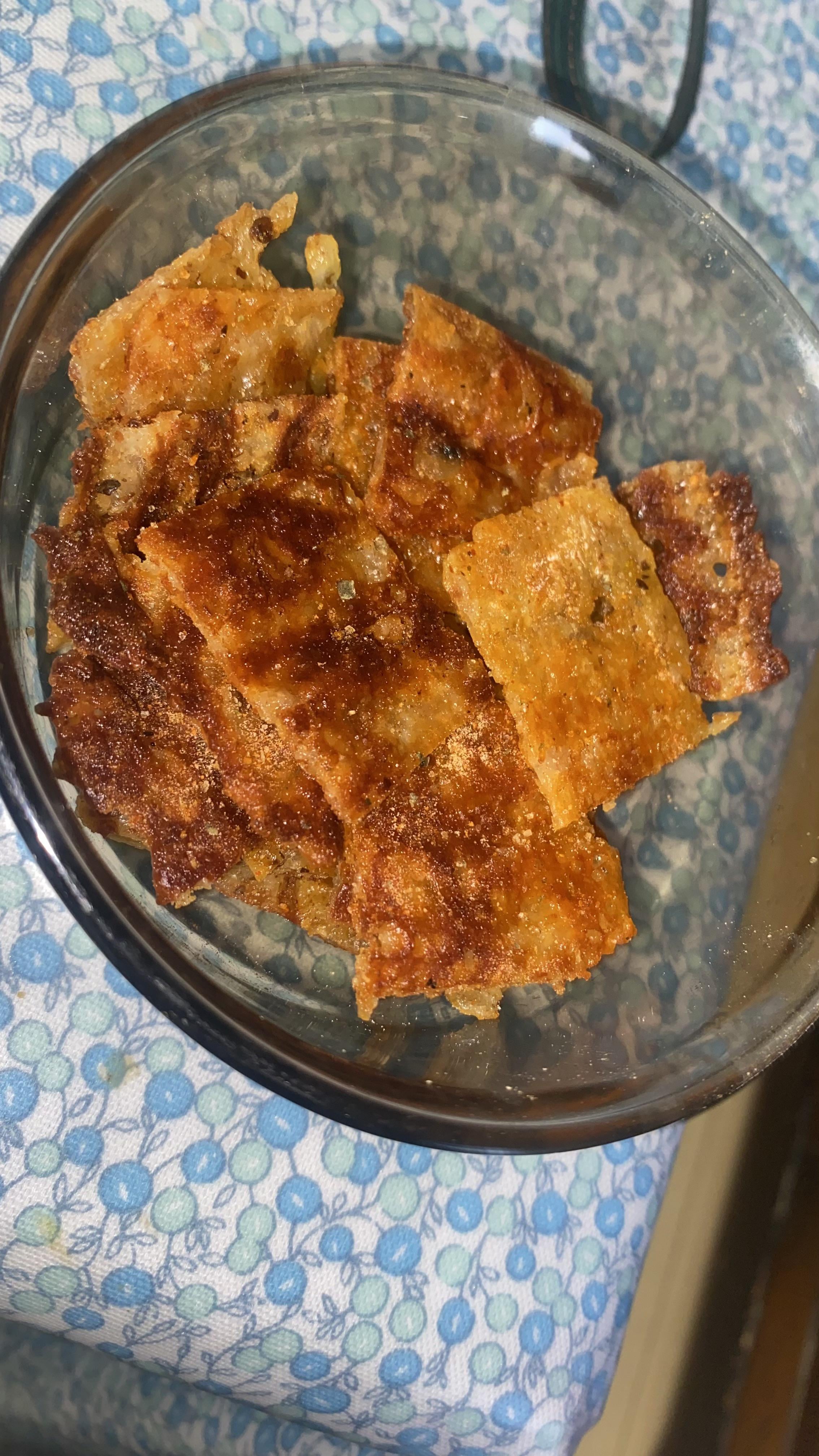 Recipe: loads of shredded mozzarella straight onto the George Foreman grill, I let it melt and then crisp up. Once it looked good I took it off to cool down and gain some rigidity and then cut into inch sized squares. Then put them in a bowl with some seasoning and tossed them around. Great snack while watching House MD