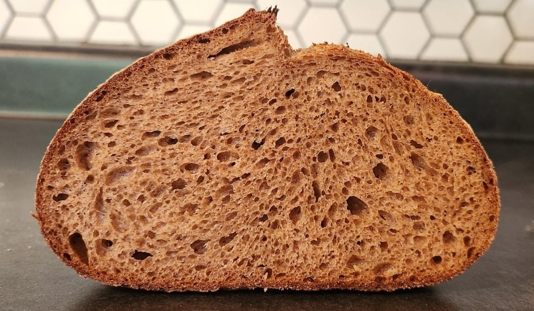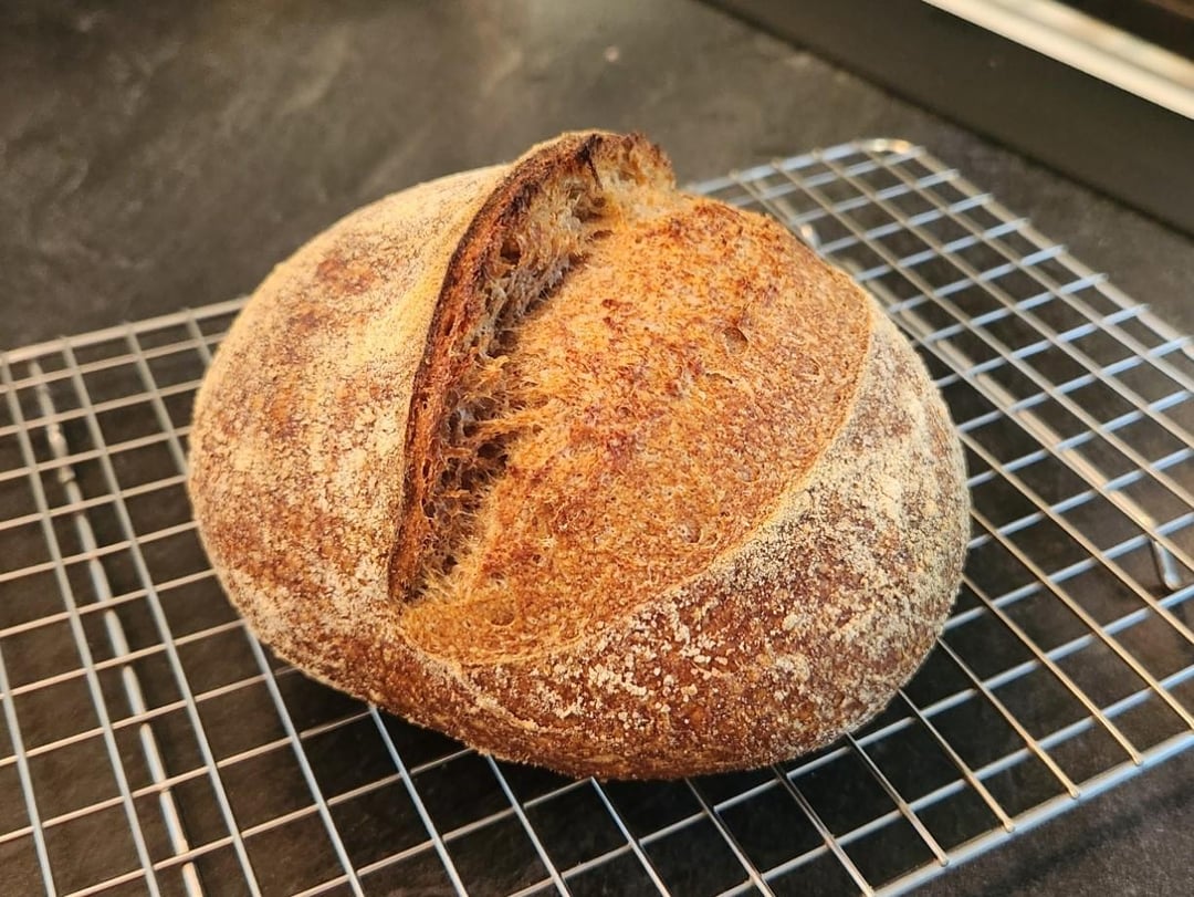 Autolysed for an hour. Mixed w/ dough hook in stand mixer until windowpane, 12-15 minutes. Bulk fermentation around 6 hours, shooting for around 75% increase. 12-14 hour cold proof. Baked in preheated dutch oven for 16 minutes at max oven temp, finished on the oven rack at 430 for another 10-15 minutes.