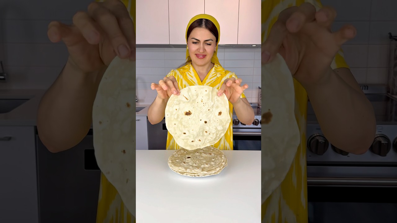 To make thin tortillas: Wheat flour – 350 g Hot water – 200 g Salt – 1 tsp without slide Vegetable oil – 2 tablespoons 1. Add salt, vegetable oil and hot water to the flour. Use a spoon to knead the dough. When it has cooled down a little, you can continue kneading the dough with your hands. 2. Put the dough in a bag and let it rest for 20 minutes. 3. Divide into 10-12 equal parts. Roll each piece into a thin cake. 4. Fry in a dry skillet for 30-60 seconds on each side. 5. Sprinkle each cake with water, cover with cling film (parchment or foil) and let sit for 10-20 minutes. * Для приготовления тонких лаваша: Пшеничная мука – 350 г Горячая вода – 200 г Соль – 1 ч. л. без горки Растительное масло – 2 ст. л. 1. Добавьте в муку соль, растительное масло и горячую воду. Ложкой замесите тесто. Когда оно немного остынет, можно продолжить замешивать тесто руками. 2. Положите тесто в пакет и дайте ему отдохнуть 20 минут. 3. Разделите на 10-12 равных частей. Каждую часть раскатайте в тонкую лепешку. 4. Жарьте на сухой сковороде по 30-60 секунд с каждой стороны. 5. Каждую лепешку сбрызните водой, накройте пищевой пленкой (пергаментом или фольгой) и оставьте на 10-20 минут. * Yupqa lavash tayyorlash uchun: Bug’doy uni – 350 g Issiq suv – 200 g Tuz – 1 darajali choy qoshiq O’simlik yog’i – 2 osh qoshiq 1. Unga tuz, o’simlik yog’i va issiq suv qo’shing. Xamirni qoshiq bilan yoğurun. Bir oz sovib qolganda, qo’lingiz bilan xamir qorishda davom etishingiz mumkin. 2. Xamirni sumkaga soling va 20 daqiqaga qoldiring. 3. 10-12 ta teng qismga bo’ling. Har bir qismini yupqa tekis tortga aylantiring. 4. Quruq qovurilgan idishda har tomondan 30-60 soniya davomida qovuring. 5. Har bir yassi nonni suv bilan seping, oziq-ovqat plyonkasi (pergament yoki folga) bilan yoping va 10-20 daqiqaga qoldiring.