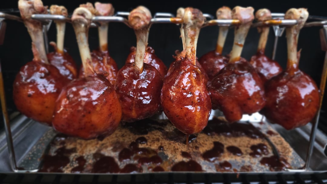 Return the legs to the smoker for 5 – 10 minutes to set and tack up the sauce.