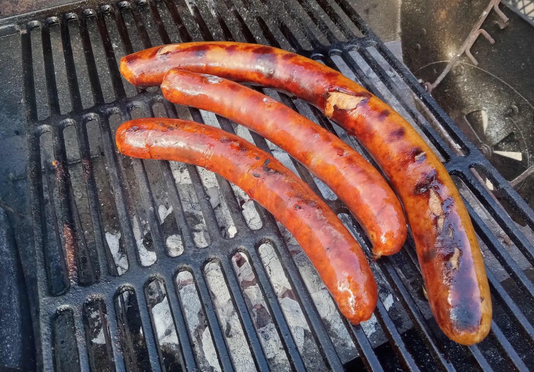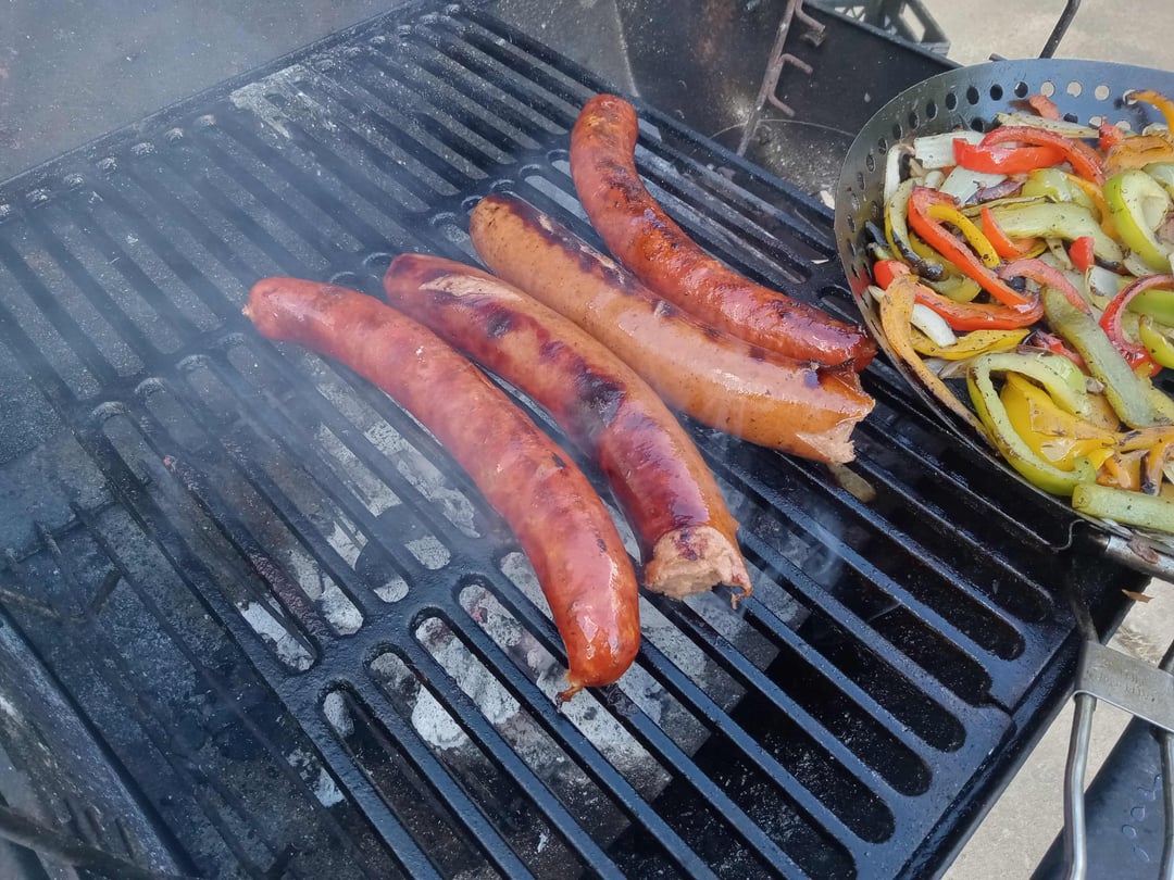 Silva(TM) linguisia and home-made Itailan snausages grilling along-side marinated peppers and onions. Their next stop is split/lightly toasted Italian rolls and aged (sharp) Arrucio provolone.