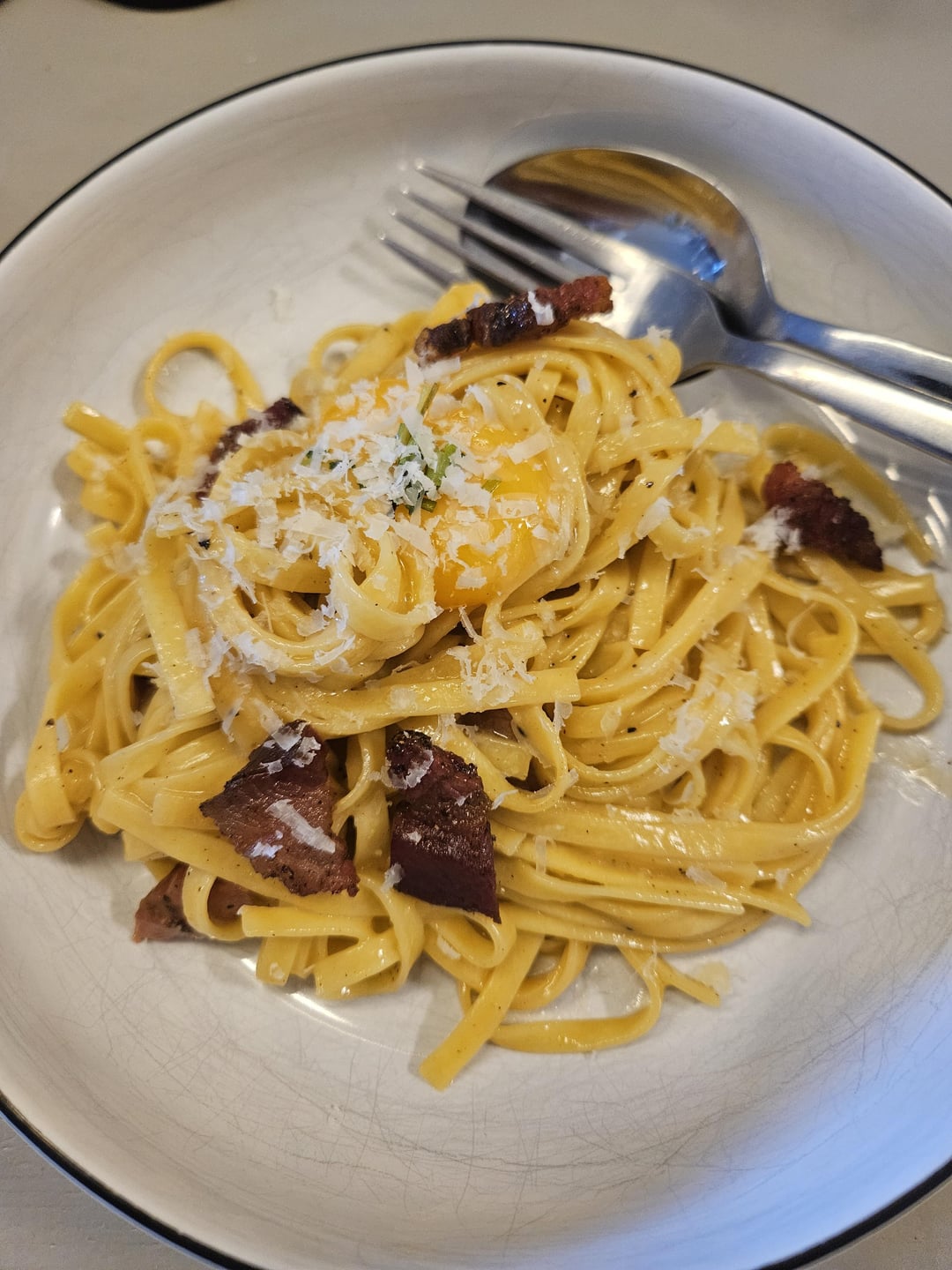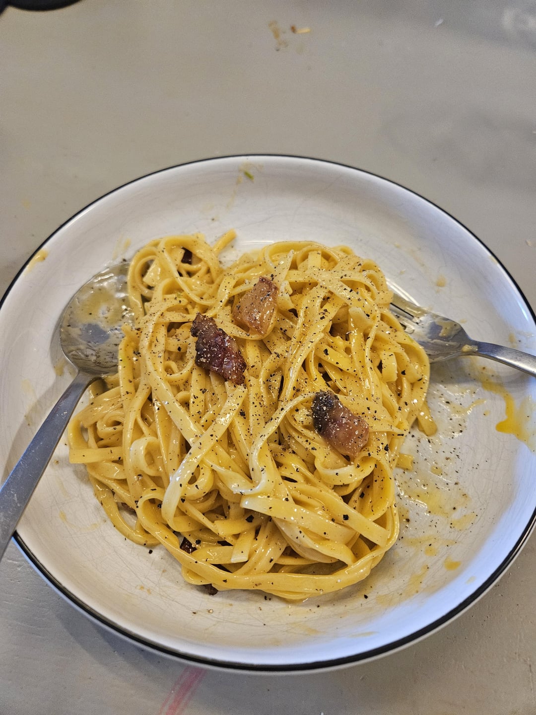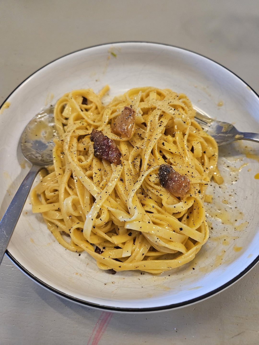 Tagliatelle, guanciale, egg's, 12mounths ripe parmezan and pepper.