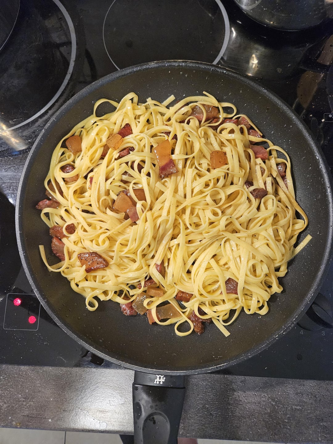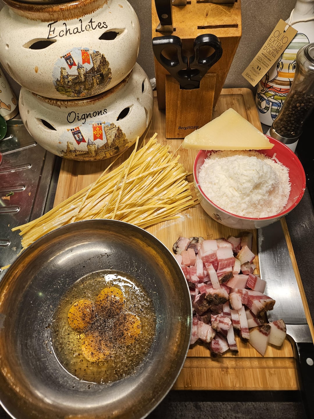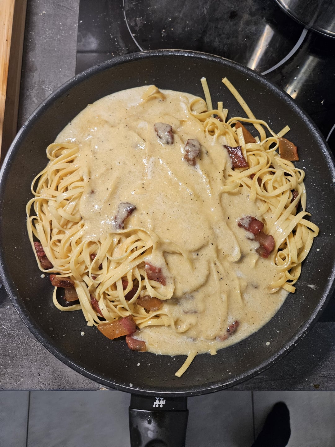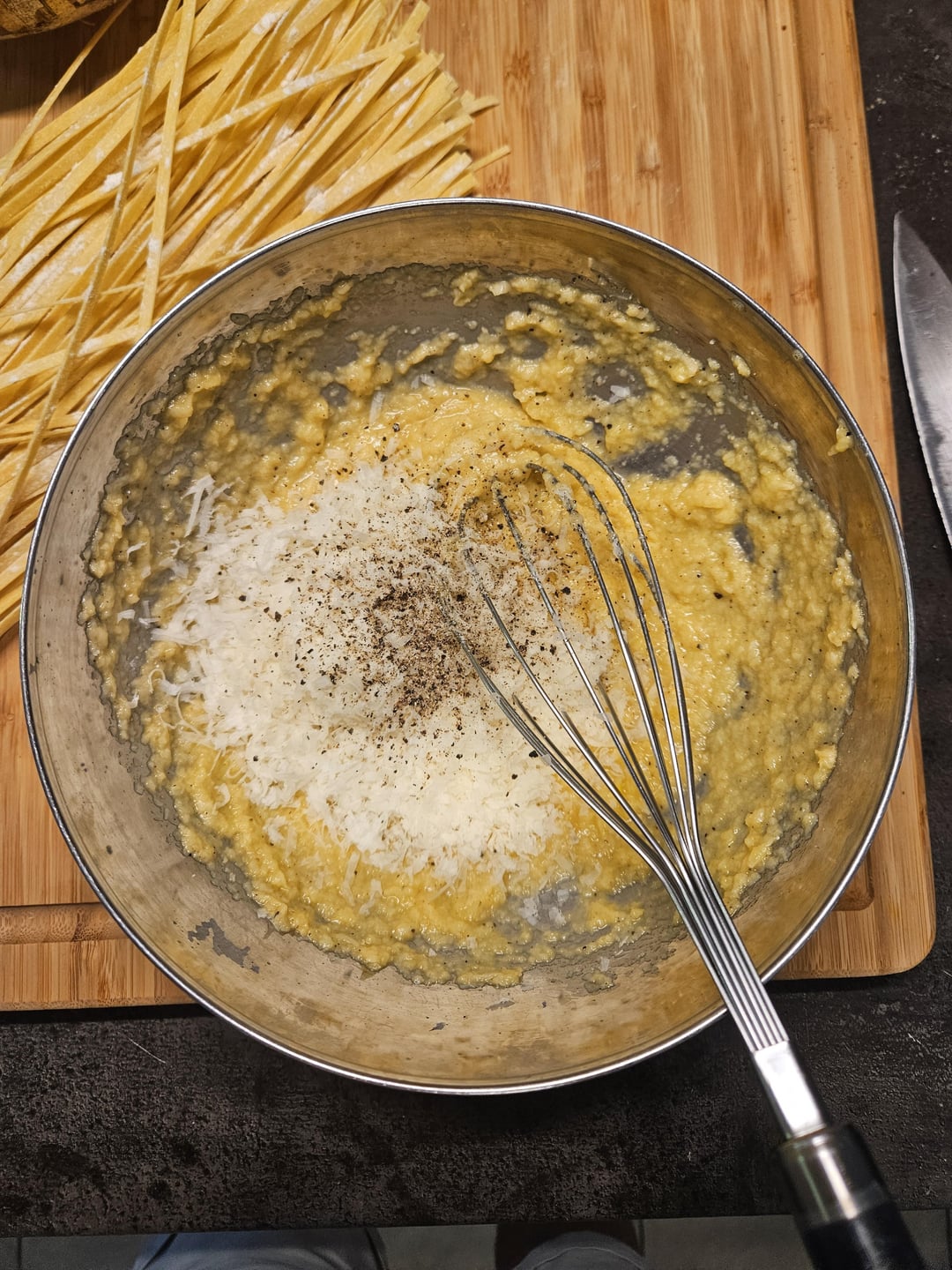 Tagliatelle, guanciale, egg's, 12mounths ripe parmezan and pepper.