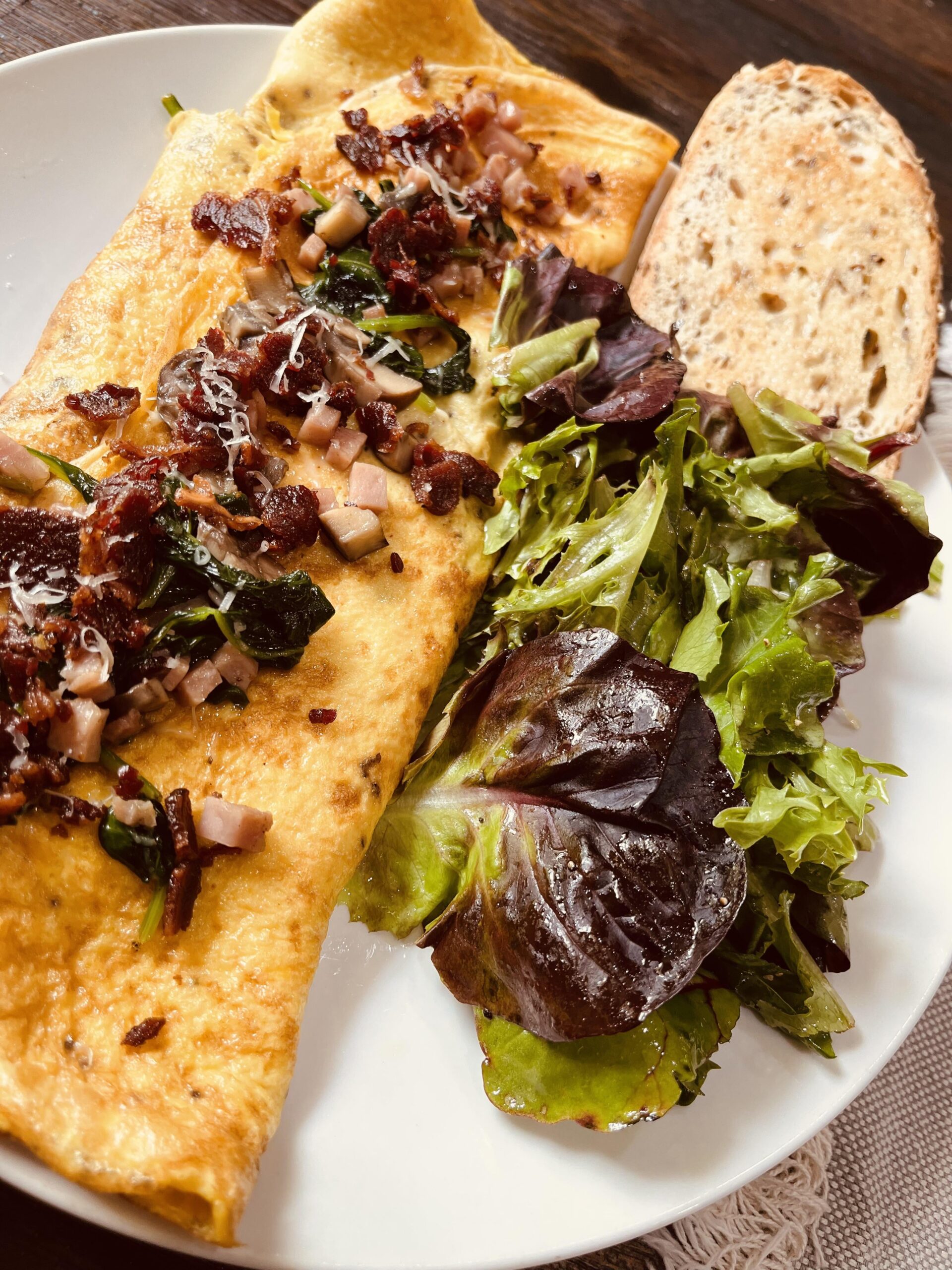 spinach mushroom and ham omelette topped with beef bacon bits, mixed green salad with a honey bell lemon vinaigrette and whole grain toast.by This-Possession-2327 Write A CommentYou must be logged in to post a comment.