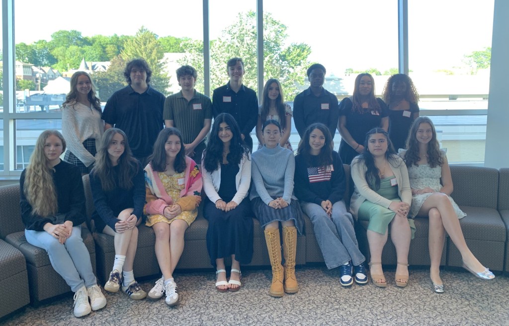 Wyoming Seminary Lower School winners who attended the awards dinner at King’s College, first row, from left, are Makayla Mason, Inaaya Nasir, Ella Maakestad, Sadie Flood, Maesy Ellis, John Kern, Faris Mostafa and Ezra Zvirblis. Second row: Monsieur Reitsma, Giovanna Ceruti, Katie Zhang, Azaria Newell, Thomas Lin and Madame Eidam. (SUBMITTED)