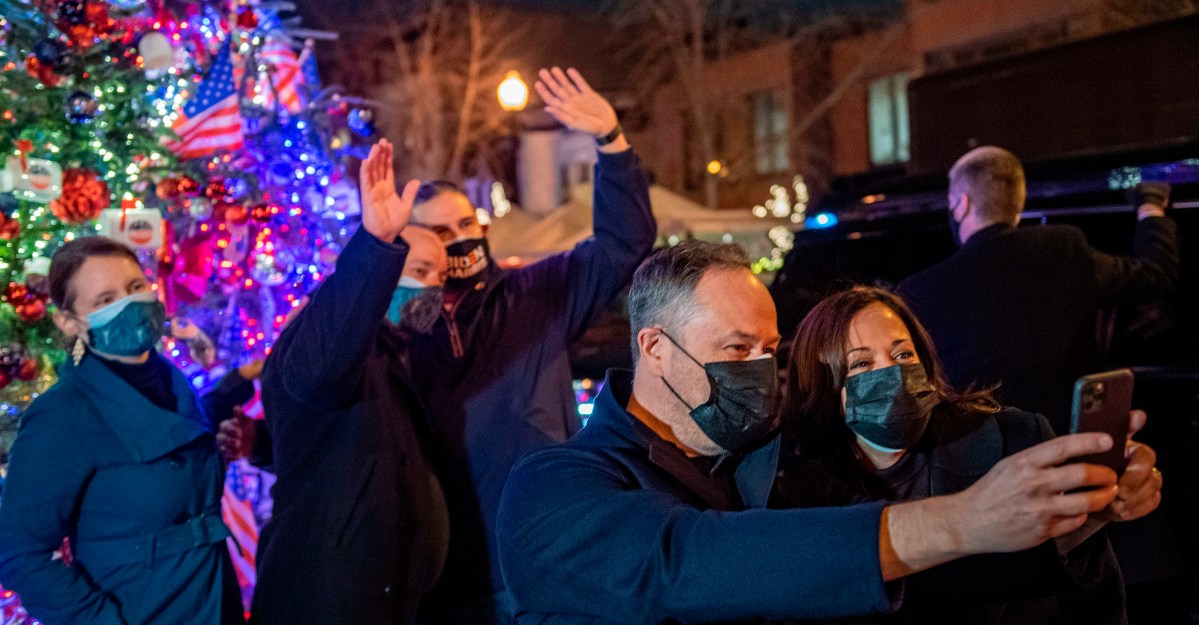 Harris and second gentleman Doug Emhoff showed up in plain black masks on Monday, January 4, to support the 41-year-old pasta place and snap a selfie of the still-standing Christmas tree on 17th Street NW festooned with American flags, blue ornaments, and cutouts of Harris and President-elect Joe Biden.