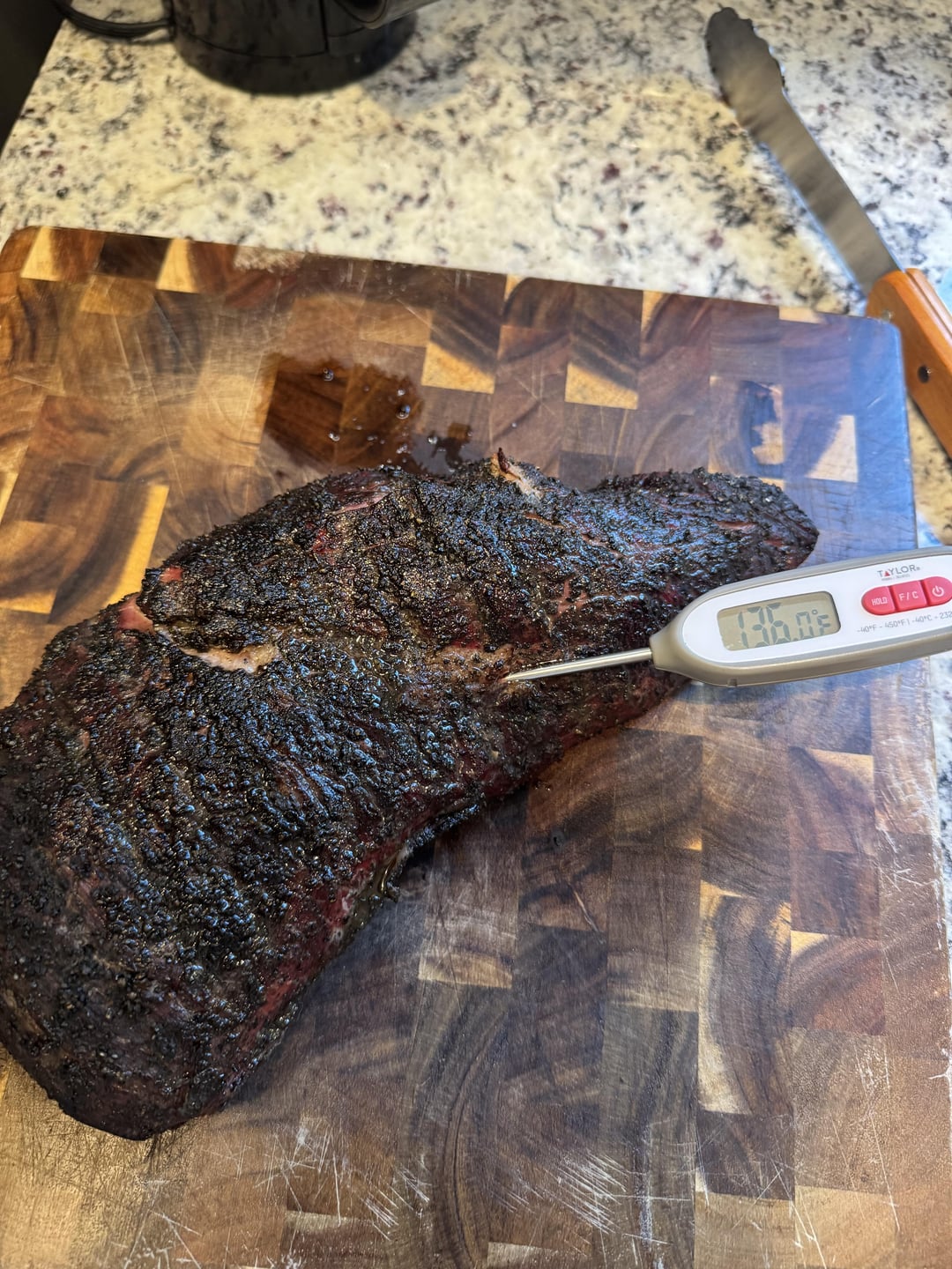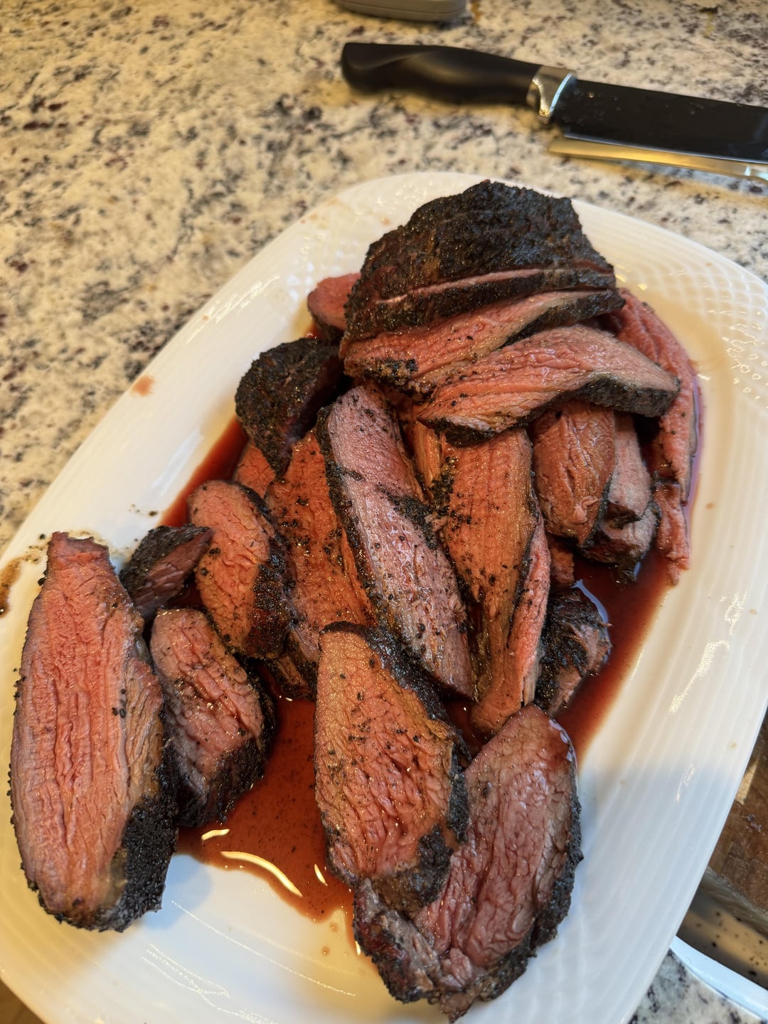 how'd I do? put the traeger to 225, added the tri tip and let it sit until it temped at 120. then pan seared it on both sides and put it in the oven until it hit 135.
