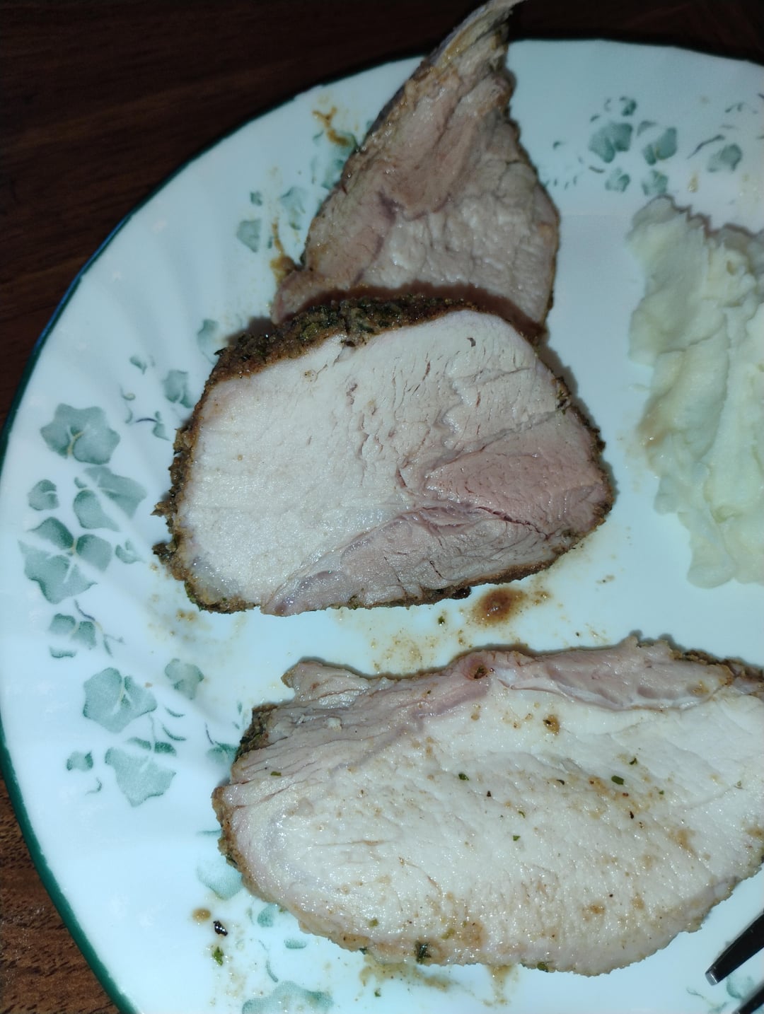 Looks ok. Im not much of a pork eater myself though. I have to have it burnt and i mean over done before ill even eat one bite. Thats one meat i HATE seeing done with pink still inside. Grosses me out. Besides that pork isnt good fir us anyway. Shoukd be left alone as far as I am concerned